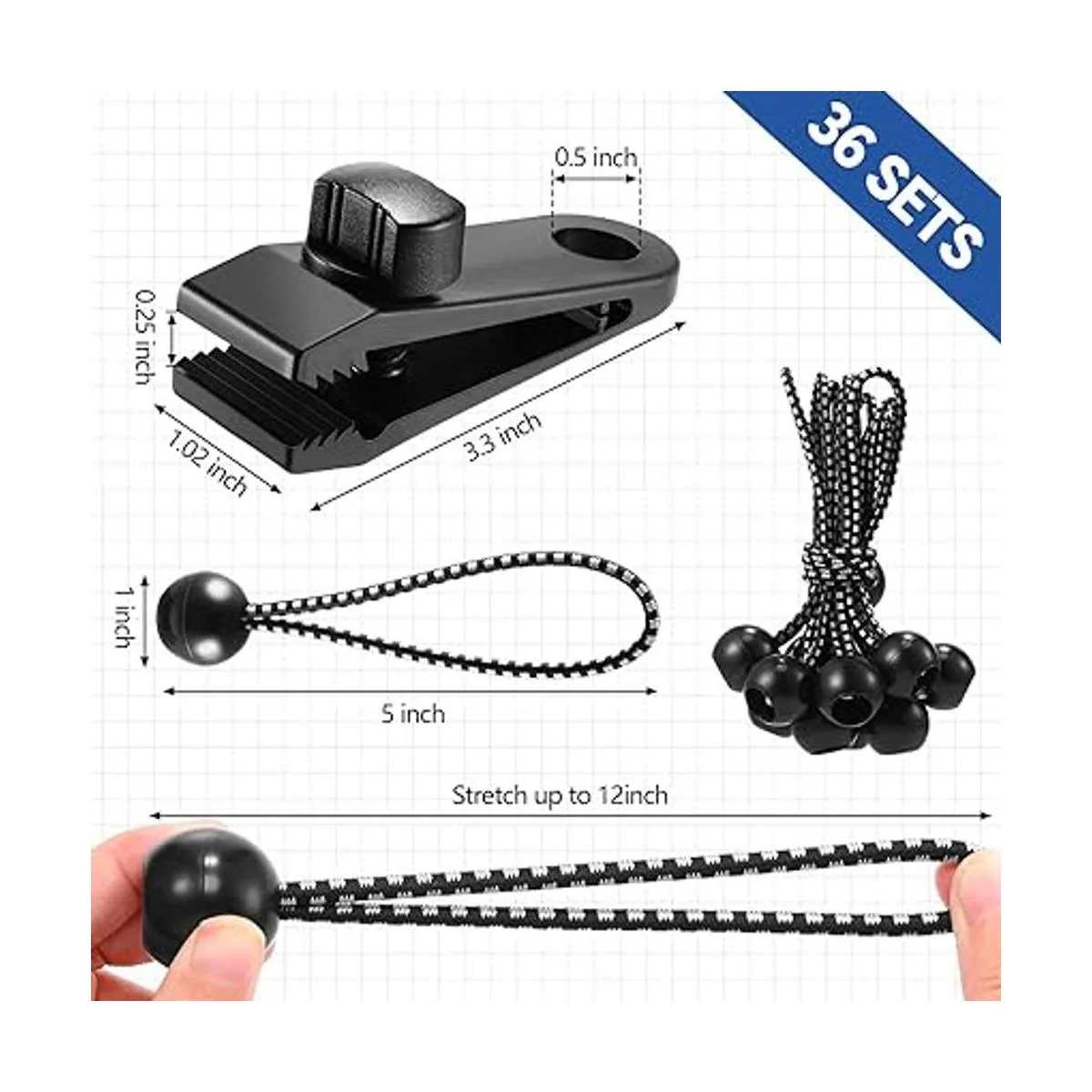Un práctico juego: puedes obtener 36 clips de lona y 36 cuerdas elásticas de bola; es ideal para trabajar como clips de lona, abrazaderas de lona resistentes, abrazaderas de lona, clip de cordón elástico de cubierta de toldo de piscina, cuerda elástica de lona con bolas, abrazaderas de lona, abrazadera de cubierta de coche y mucho más