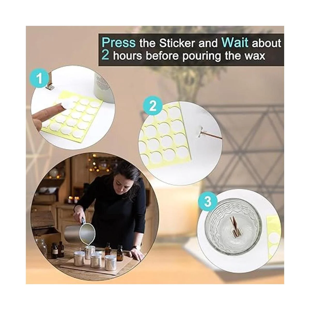 Fácil de usar: la pequeña pestaña que se extiende más allá de la capa superior hace que sea más fácil de quitar. Coloca el adhesivo de mecha de vela en la parte inferior de la mecha y pégalo debajo del frasco. Facilita el proceso de tu vela casera.