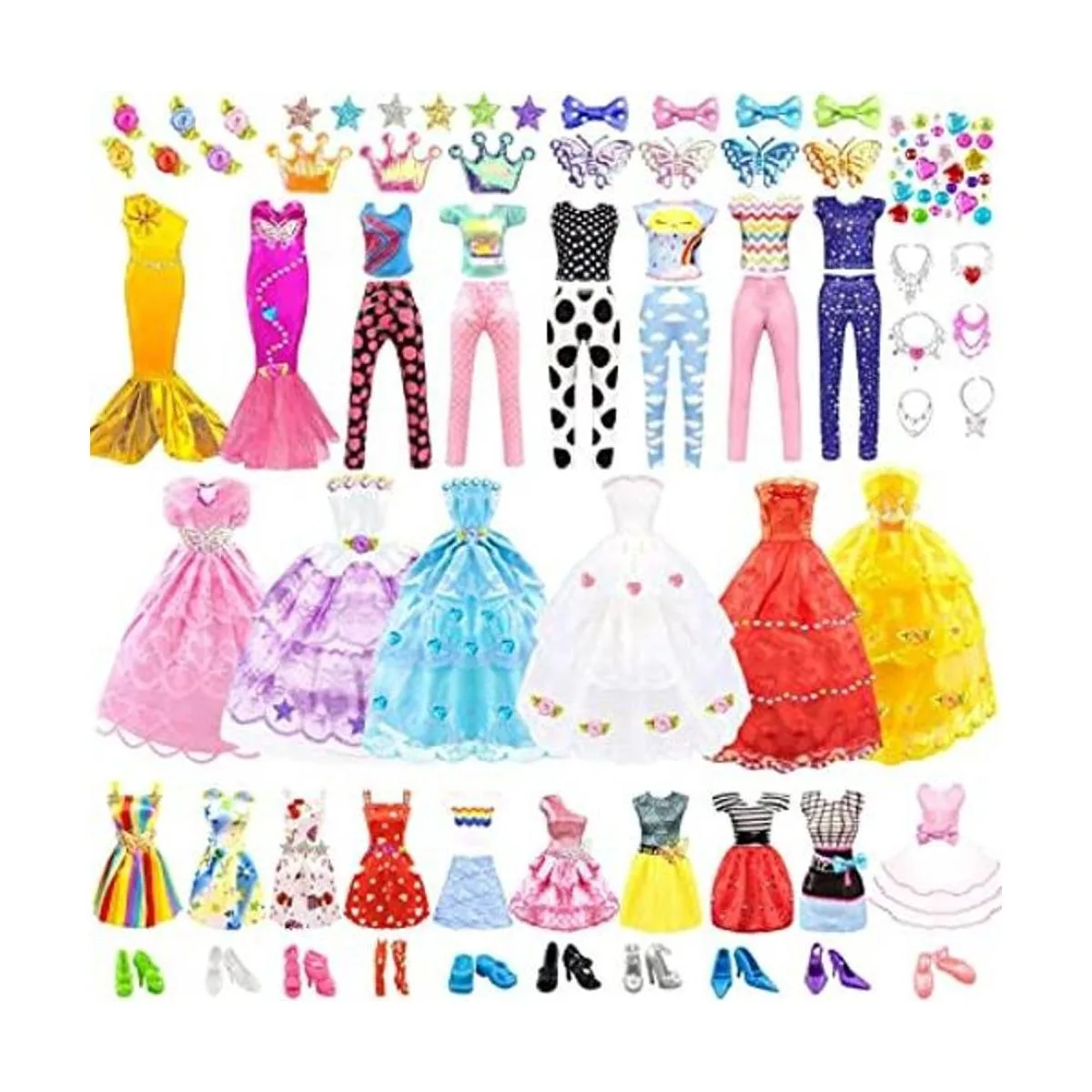 El paquete incluye: 2 vestidos de novia, 2 vestidos de fiesta, 1 vestido de moda, 3 tops y pantalones, 8 mini vestidos, 10 pares de zapatos, 6 collares, 10 lazos, 10 mariposas, 10 estrellas, 10 flores, 2 coronas, 1 hoja de calcomanías de diamantes de cristal en una caja de regalo. Nota: todos los artículos son aleatorios en estilo. Muñeca no incluida. La mayoría de los zapatos son adecuados para muñecas de pies inclinados