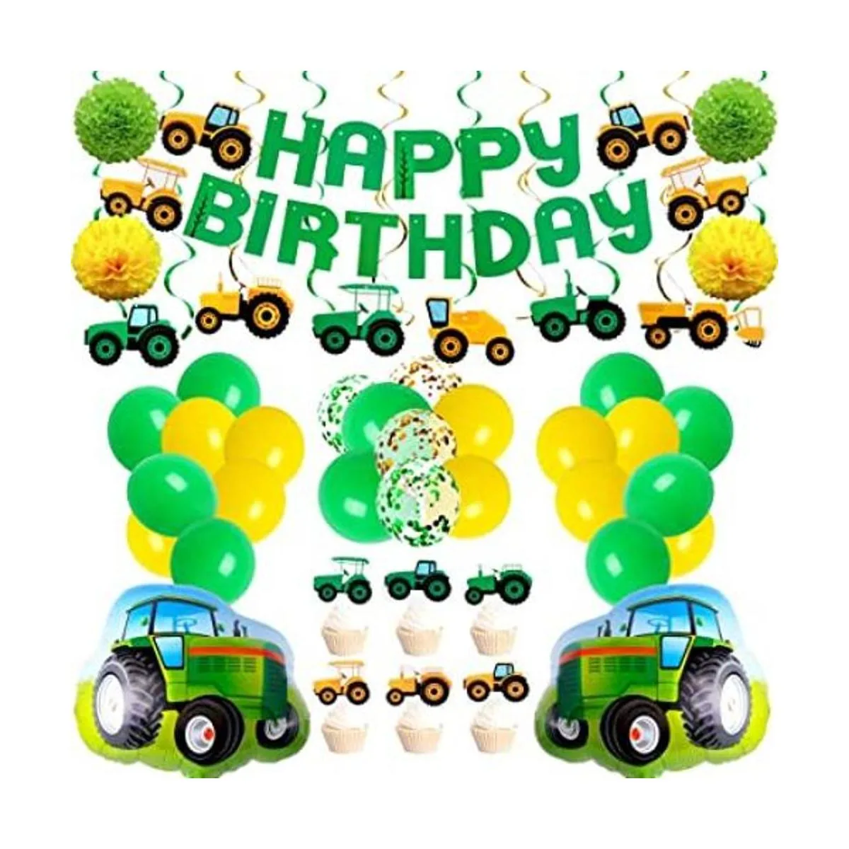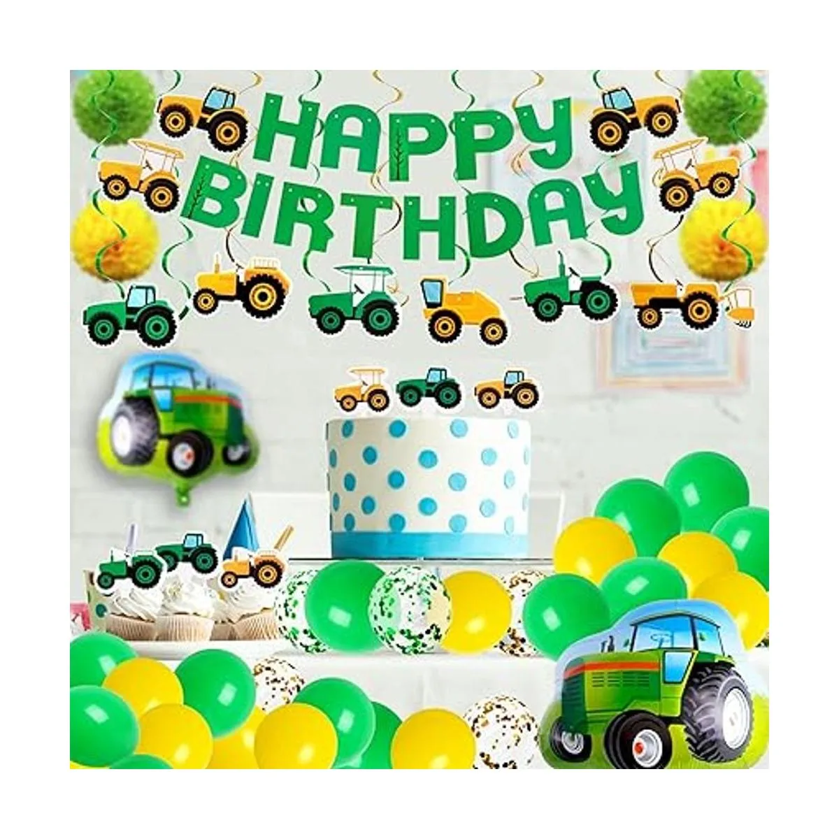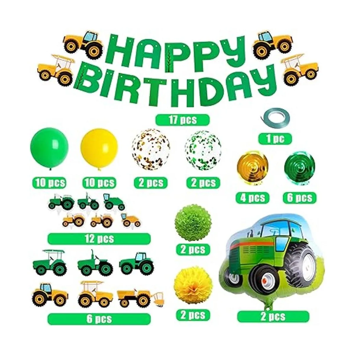 Paquete: el juego de suministros de fiesta temática de tractor verde tiene 17 pancarta de feliz cumpleaños de tractor, 20 globos de látex, 4 globos de confeti, 12 adornos para cupcakes de tractor, 4 flores de papel, 2 globos de aluminio de tractor, 10 remolinos colgantes, 6 tarjetas de tractor colgantes, 1 cuerda en espiral verde.