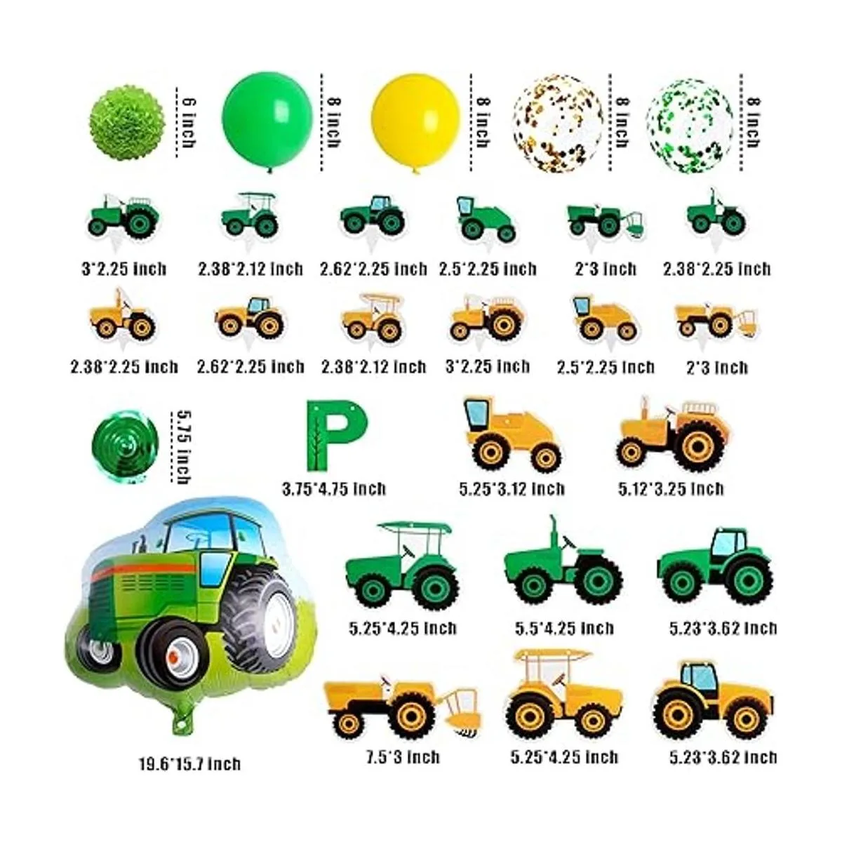 Tamaño: las dimensiones específicas del juego de decoraciones de fiesta de cumpleaños de tractor verde se muestran en la imagen.