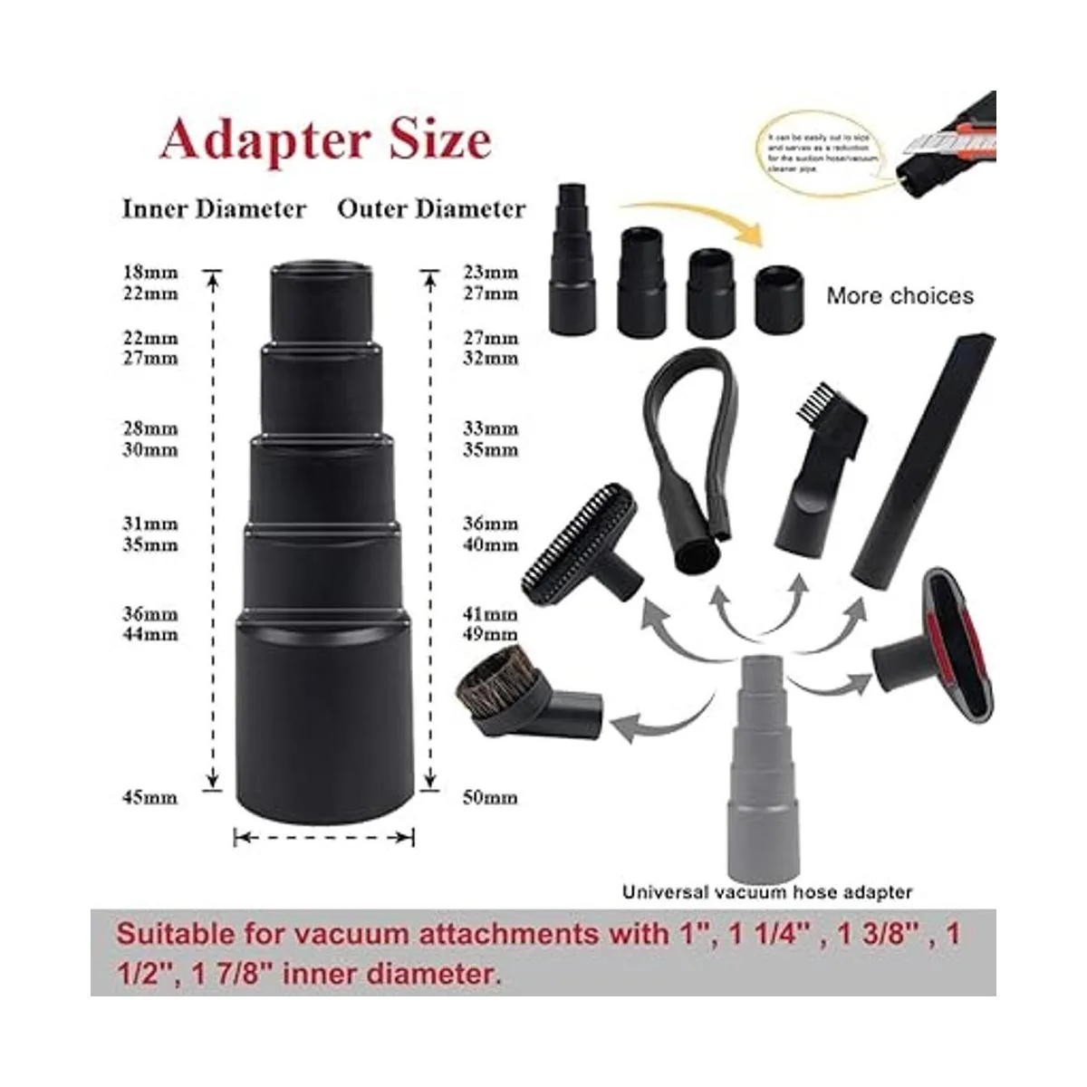 Adaptador de vacío universal de 5 capas: el diámetro exterior del adaptador de 5 capas es de 1.063 in, 1.260 in, 1.378 in, 1.575 in, 1.969 in. Adecuado para accesorios de aspiradora de tienda con 1.000 in, 1.260 in, 1.378 in, 1.535 in, 1.929 in. El adaptador de vacío se puede cortar fácilmente en un conector de 5 tamaños.