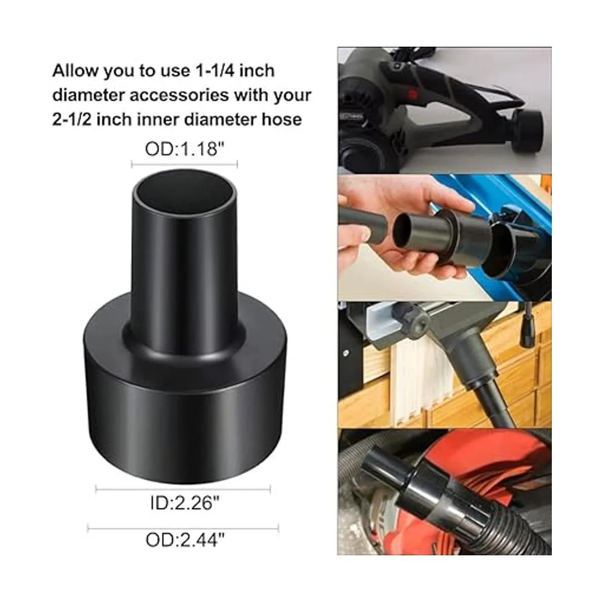 Adaptador de manguera de vacío de 2 1/2 a 1 1/4 pulgadas. Extremo grande: el diámetro exterior es de 2.4 pulgadas, el diámetro interior es de 2.2 pulgadas. Extremo pequeño: el diámetro exterior es de 1.2 pulgadas, el diámetro interior es de 1 pulgada. El reductor de 2.5 a 1.25 pulgadas te permite utilizar todos tus accesorios de aspiradora de 1 1/4 pulgadas con aspiradora de 2 1/2 pulgadas de diámetro interior.