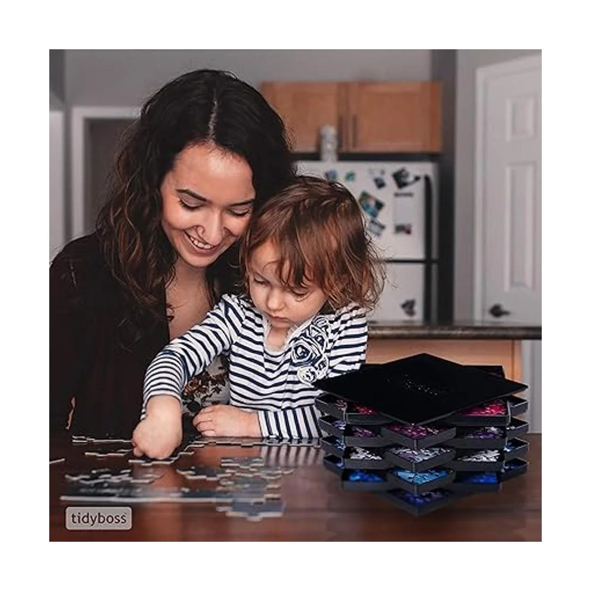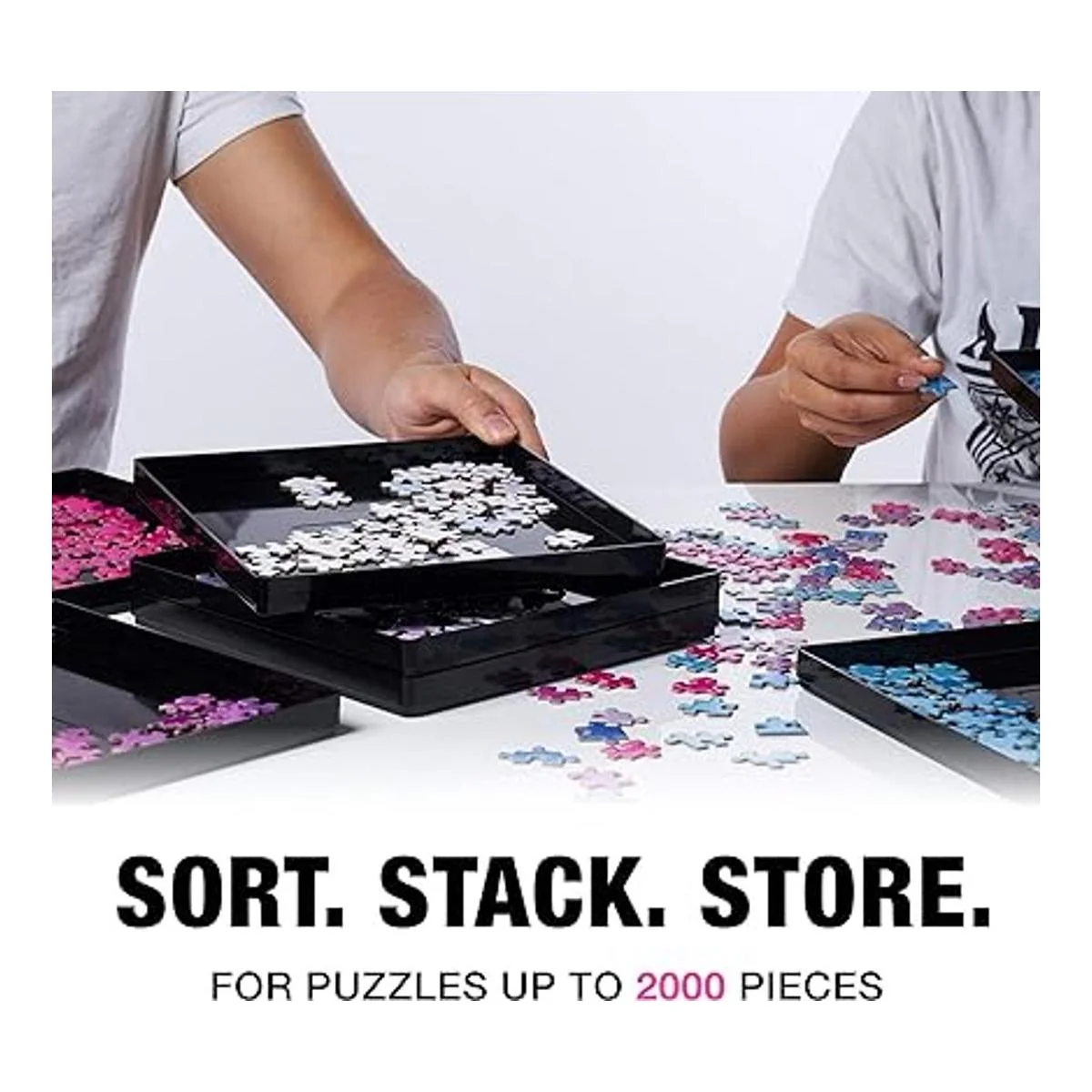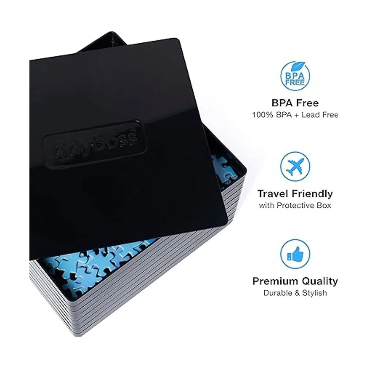 Lleva los rompecabezas al siguiente nivel: Ahhhh, la sensación satisfactoria de que una pieza de rompecabezas cae correctamente en su lugar. Felicidad pura Con el organizador de rompecabezas de 8 piezas Tidyboss, ahora puedes resolver rompecabezas más rápido y fácil, todo mientras ahorras tiempo y espacio en la mesa Nuestros tableros de rompecabezas portátiles son perfectos para niños y adultos de todas las edades y hacen que organizar sea muy fácil. Además, con plástico ABS duradero y un diseño apilable compacto, las bandejas se anidan perfectamente en su caja para un transporte súper seguro