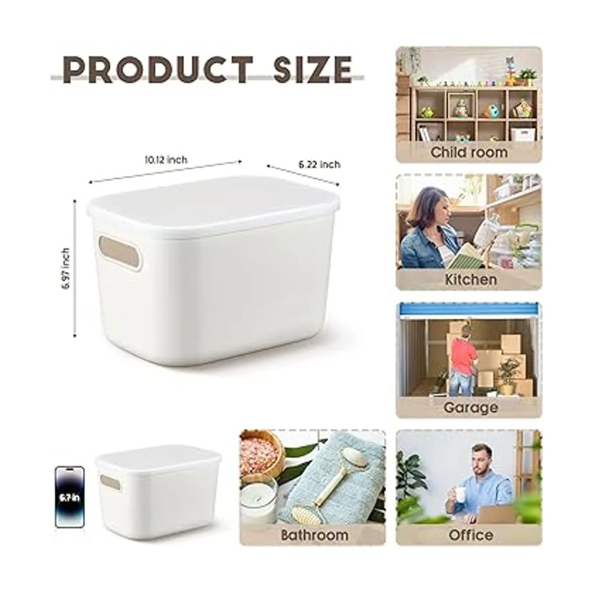 Limpio y limpio: los contenedores de almacenamiento de plástico con tapas son de aproximadamente 7.3 x 10.2 x 6.5 in, se pueden utilizar para almacenar muchas cosas, como decoraciones de vacaciones, ropa, juguetes para niños, suministros de oficina, suministros de baño, artículos de garaje, etc., para ofrecerte una sensación cómoda