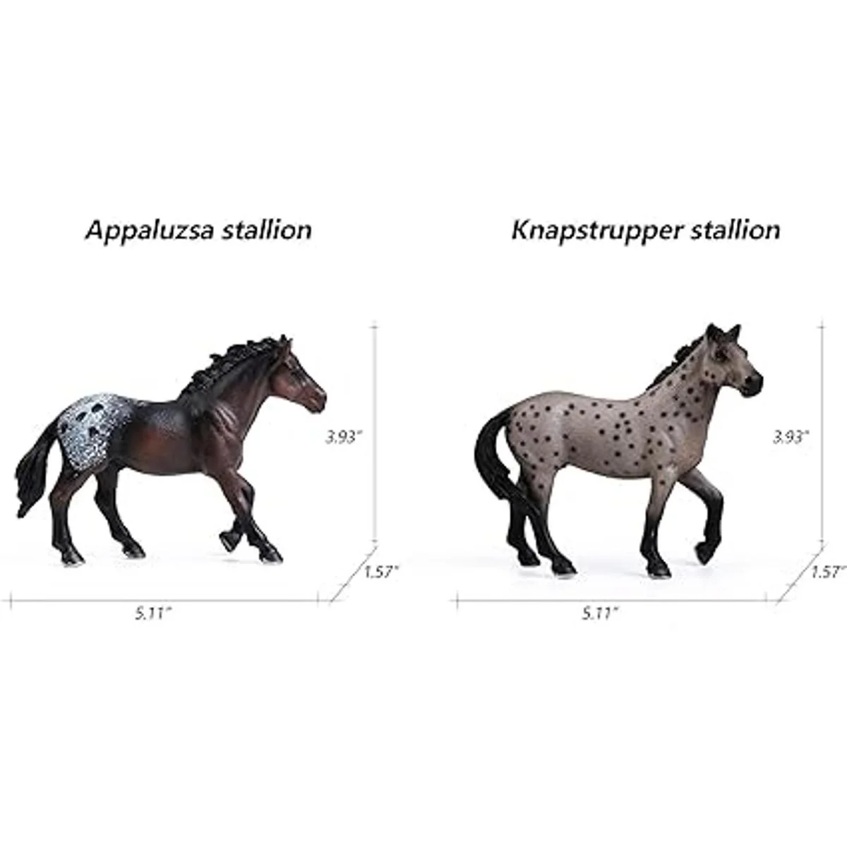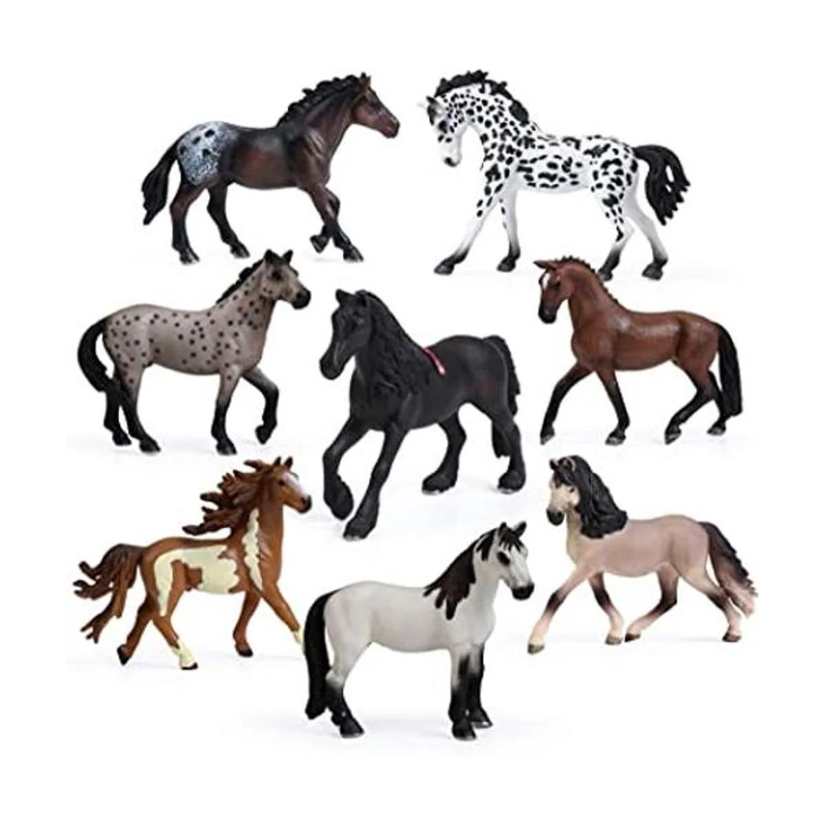 El set de 8 piezas de juguete de caballos incluye: Semental pinto, yegua Knabstrupper, semental Appaloosa, semental Knapstrupper, yegua andaluza, yegua frisona, yegua hannoveriana y yegua Tennessee.
