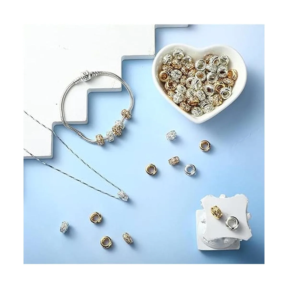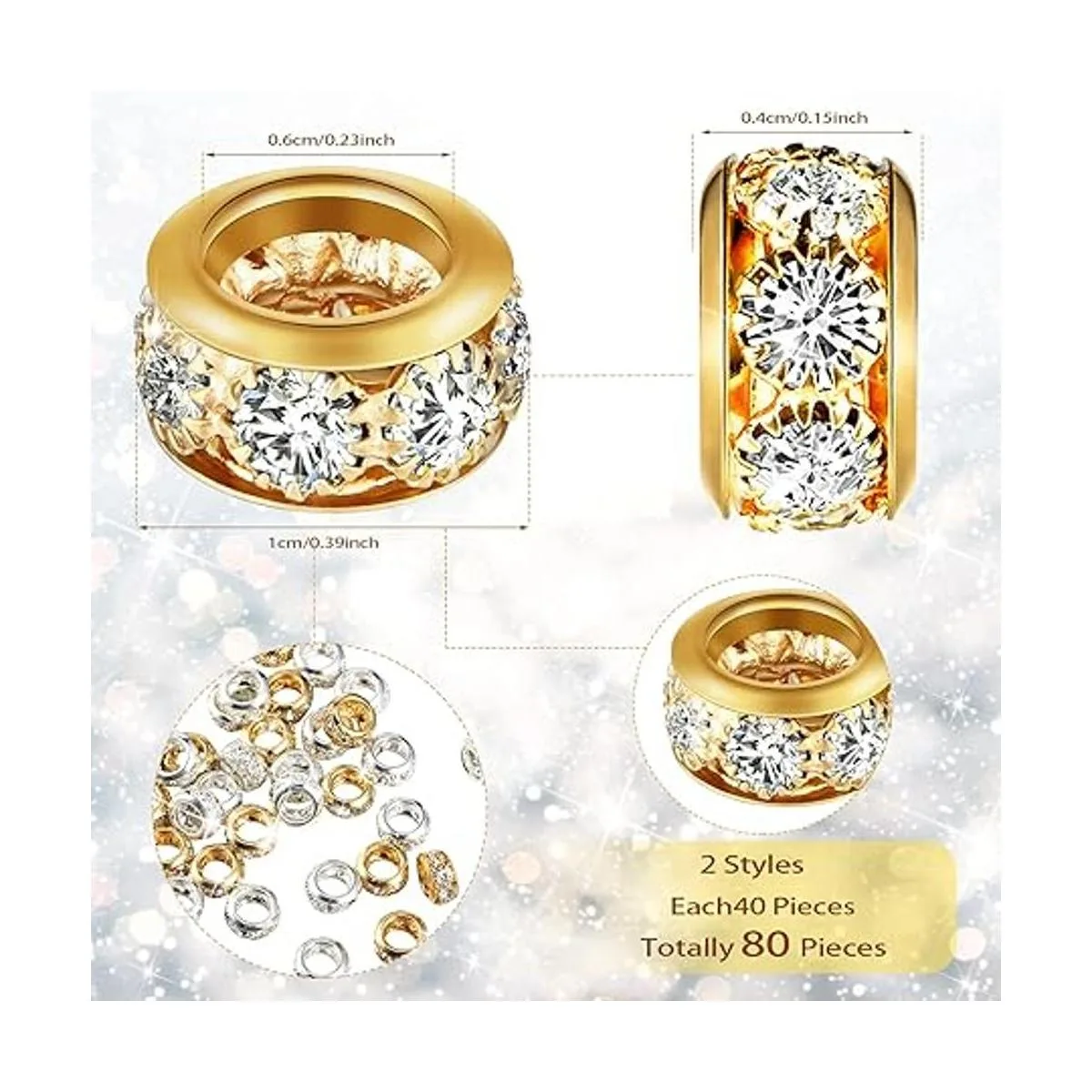 Cantidad suficiente: hay 80 cuentas de diamantes de imitación de agujero grande en el paquete que están disponibles en 2 colores diferentes, es decir, plata y oro, 40 piezas de cada color, lo que es suficiente para que las prepares para varios proyectos de fabricación de joyas y manualidades