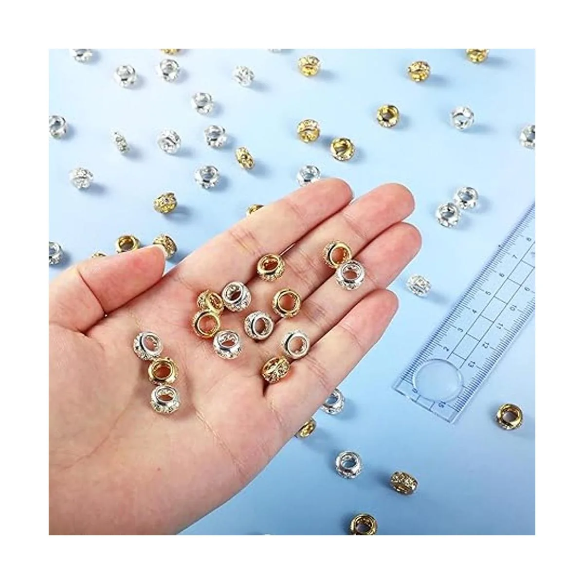 80 cuentas de diamantes de imitación de agujero grande de 0.394 in, cuentas espaciadoras de cristal pavé de oro plateado, cuentas de agujero grande, diamantes de imitación pavé cuentas europeas para hacer joyas, pulseras, collares, suministros de manualidades