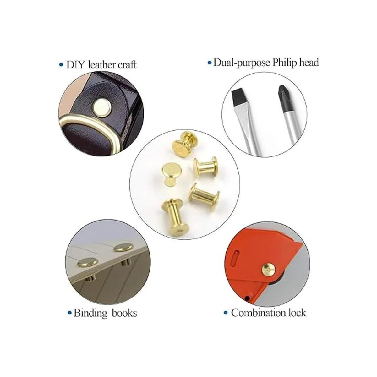 Ampliamente utilizado en manualidades de cuero y encuadernación: estos tornillos de cuero son perfectos para añadir adornos a la decoración de manualidades. Especialmente adecuado para varias manualidades de cuero como cinturones, bolsos, zapatos de cuero, encuadernación de documentos, libros, álbumes de fotos, manualidades. Se puede utilizar como quieras.