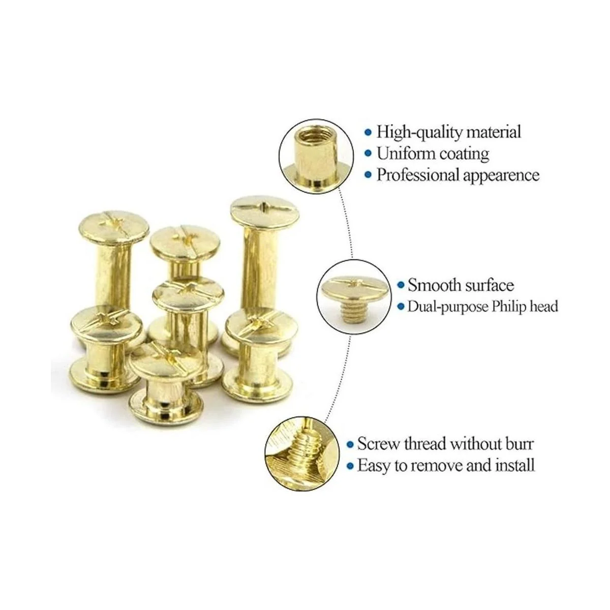 Cabezal Philips de doble propósito y fácil de unir: cabeza Philip de diseño delicado, se puede utilizar con cualquier destornillador estándar repetidamente. El acabado de estos botones Chicago es muy agradable para ser usado como artículos de alta producción. El acabado es excelente, los cabezales de tornillo están muy bien biselados cónico, las ranuras son de perfil bajo y tienen un aspecto profesional, se pueden quitar e instalar fácilmente. Puedes añadir o restar tanto papel como quieras.