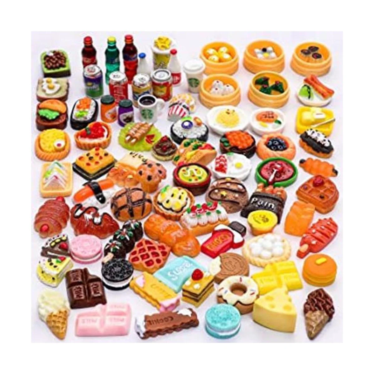 Material de alta calidad: estos mini accesorios de alimentos y bebidas están hechos de resina no tóxica en colores brillantes, estos bonitos juguetes de comida pequeños en miniatura son seguros para jugar; el tamaño promedio de alimentos mide aproximadamente 0.3 a 1.2 pulgadas, evita que se traguen. Trae mucha diversión.