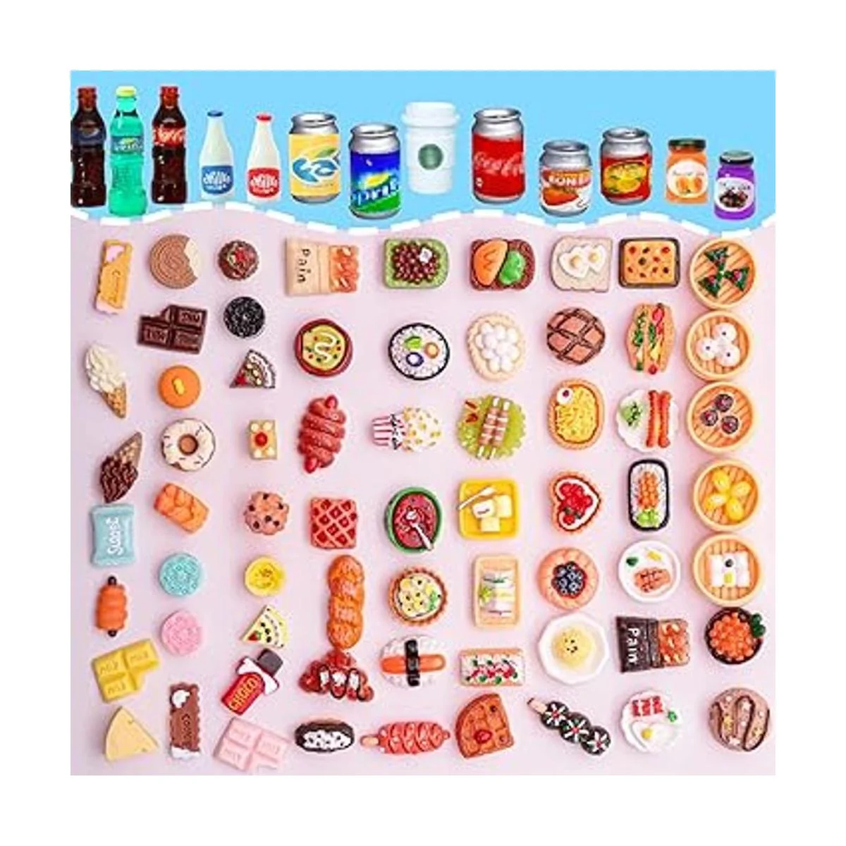 Bebidas de alimentos en miniatura: paquete económico de 80 piezas. Incluye varios estilos de diferentes juguetes de alimentos, como mini alimentos, bebidas, botellas de bebidas, hamburguesas, papas fritas, pasteles, té de leche, pan, chocolate, helado, leche, bebidas, mini cosas, bollos, etc., cantidad suficiente y estilos que pueden ayudar a aliviar el estrés, desarrollar la creatividad y la imaginación, trayendo un montón de diversión pequeños reales