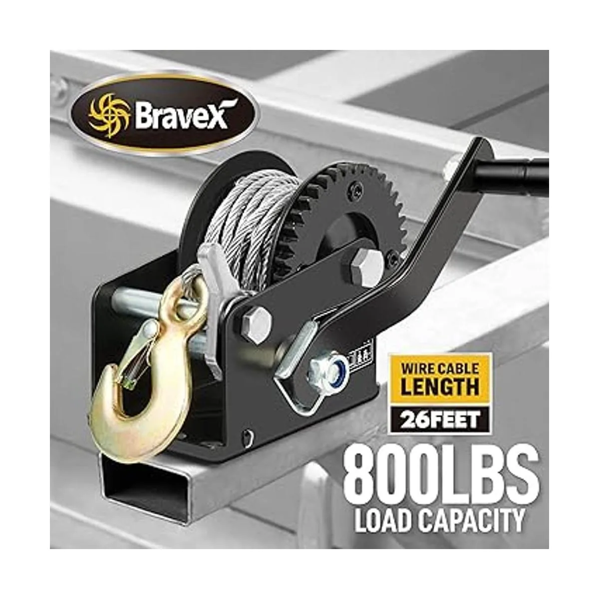 HighQuality Hand Trailer Winch High carbon steel gears to resist wear and last longer, superior corrosion resistance. This winch is solidly constructed with 26feet, 4mmcable diameter high quality steel wire rope, its strong enough and the metal does not twist or warp when cranking.