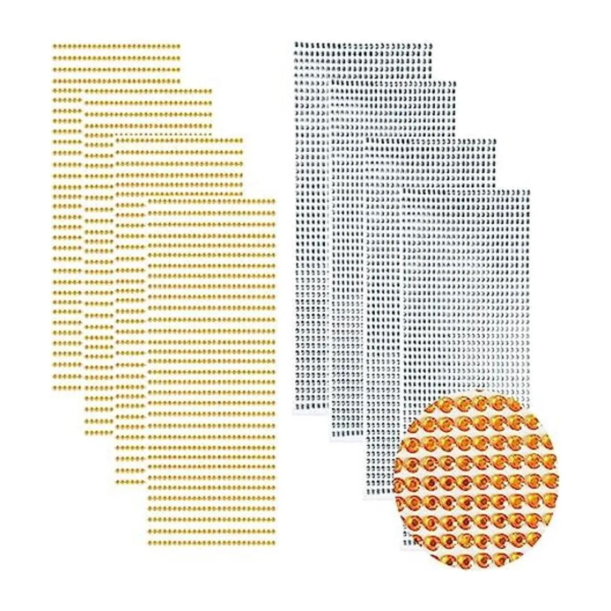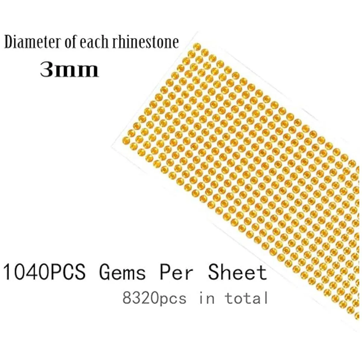 El paquete incluye: 8 hojas de calcomanías de diamantes de imitación en color dorado y transparente. Cantidad: 1040 piezas de diamantes de imitación cada hoja. 8320 unidades en total.