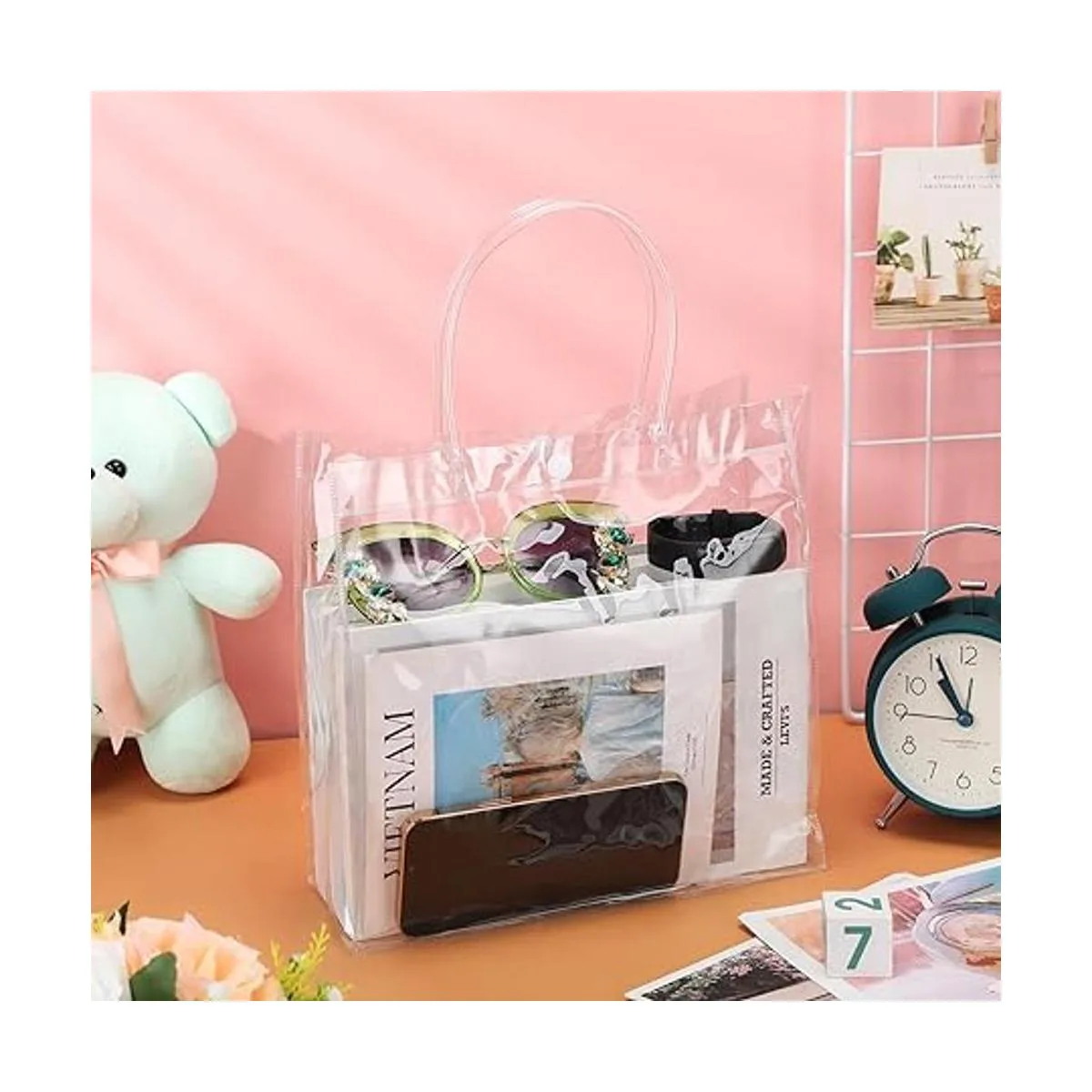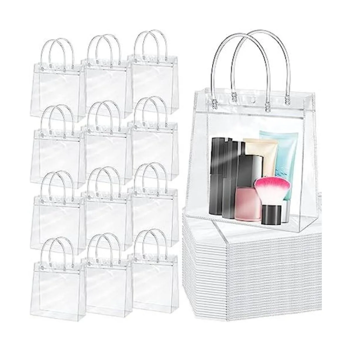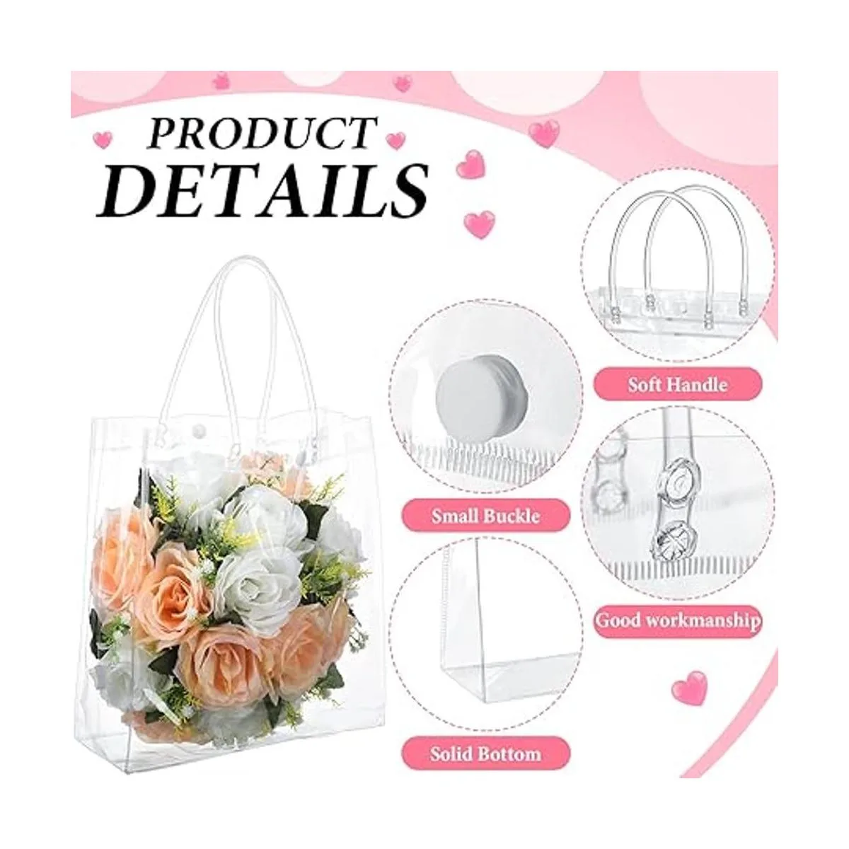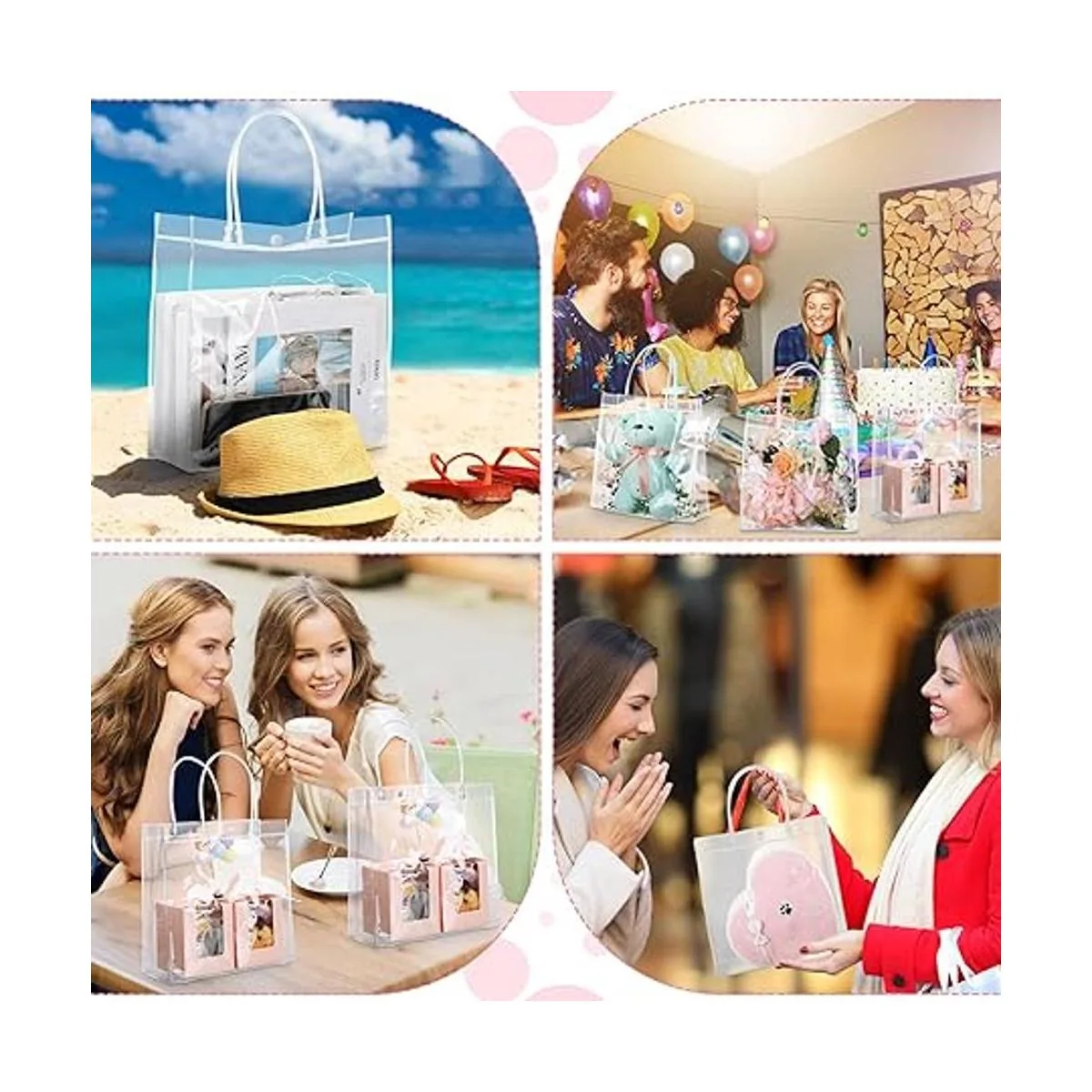 Material de PVC de calidad: nuestras bolsas de regalo transparentes reutilizables están hechas de material plástico de PVC transparente de calidad, duradero y reutilizable y tienen una mayor capacidad de carga que el papel normal o las bolsas de comestibles, pueden servirte durante mucho tiempo, se pueden plegar para almacenamiento cuando no estén en uso, pero ten en cuenta que se arrugarán