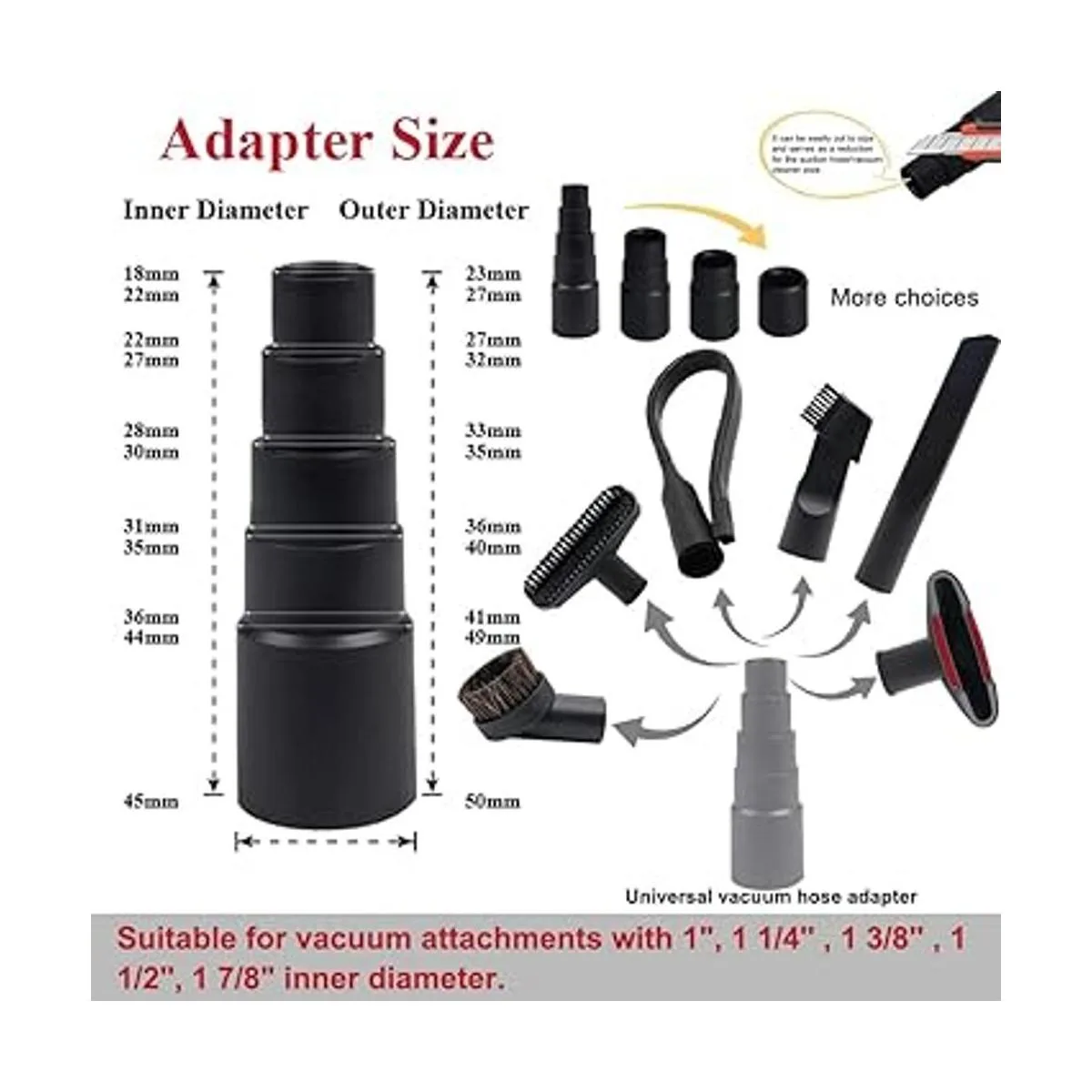 Adaptador de vacío universal de 5 capas: el adaptador de vacío de goma se puede cortar fácilmente en un conector de 5 tamaños para satisfacer tus diferentes necesidades. El diámetro exterior del adaptador de 5 capas es de 1.063 in, 1.260 in, 1.378 in, 1.575 in, 1.969 in. Adecuado para accesorios de aspiradora de tienda con 1.000 in, 1.260 in, 1.378 in, 1.535 in, 1.929 in.