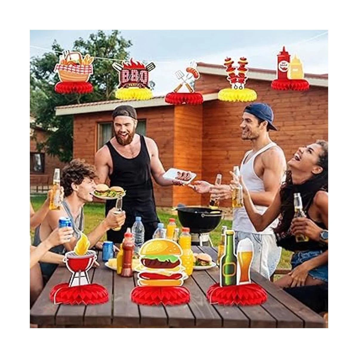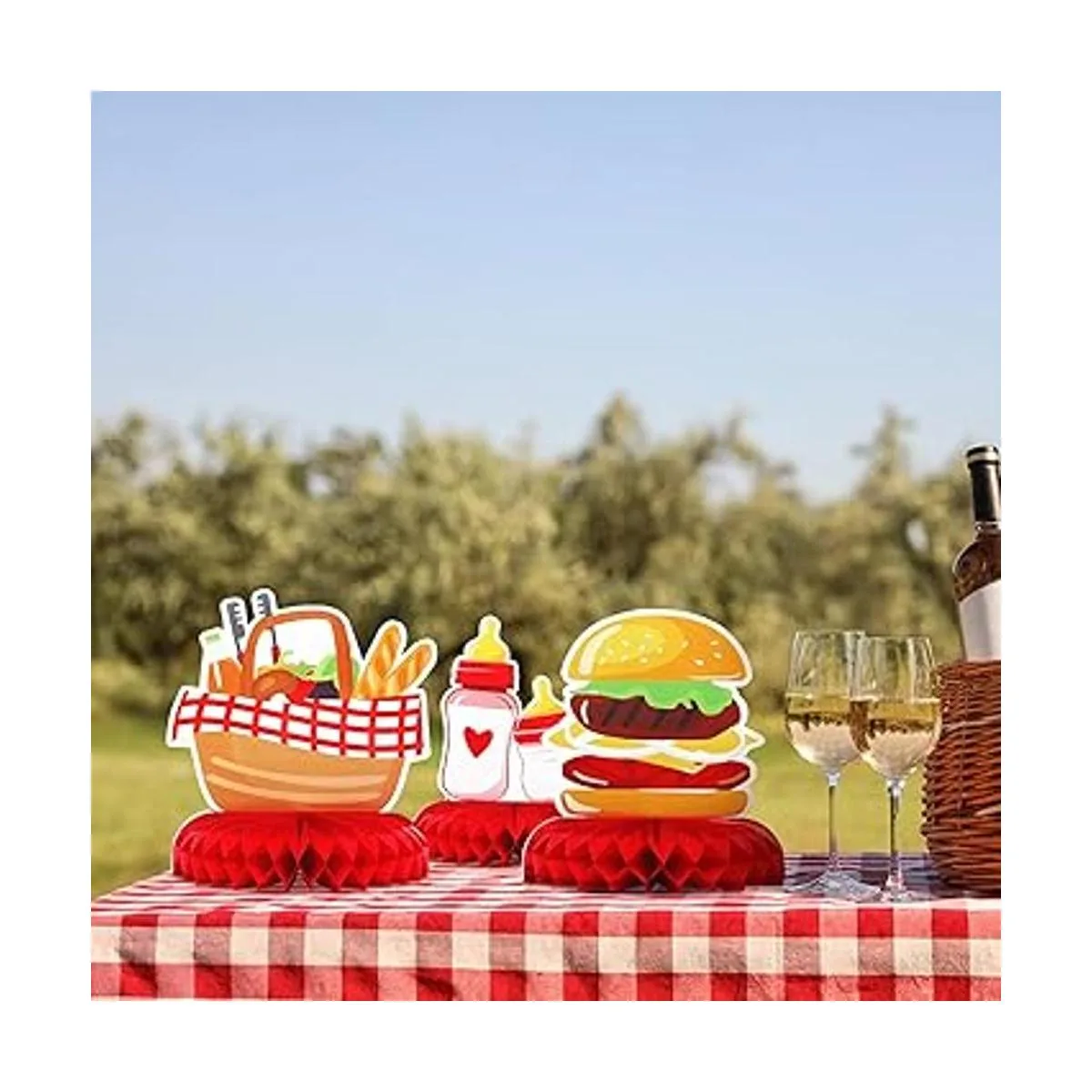 Diseño temático de barbacoa: estos centros de mesa de panal temático de picnic están diseñados con muchos patrones, como a cuadros, hamburguesa, botella, cerveza, parrilla y otros elementos, llamativos y en línea con la fiesta temática de barbacoa