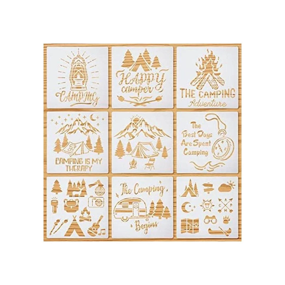 9 plantillas de dibujo de campamento temático campamento plantillas de pintura al aire libre campamento plantillas para bricolaje cuaderno dibujo trazado decoraciones, 8 x 8 pulgadas de cada uno