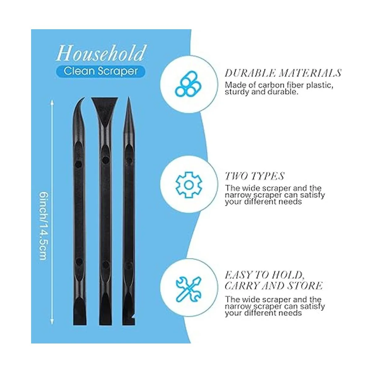 3 tipos de herramientas de raspador bidireccional: los 3 tipos de raspadores de plástico de dos vías sin arañazos son adecuados para varias ocasiones; el cabezal de raspador ancho se puede aplicar para raspar áreas amplias, como manchas en el suelo, chicle, calcomanías, etiquetas, etc. El cabezal estrecho del rascador puede limpiar espacios estrechos, así como lugares difíciles de alcanzar del cuerpo exterior del coche y el lugar interior; y el rascador puntiagudo es muy adecuado para limpiar grietas más estrechas, como esquinas estrechas, bordes, ranuras