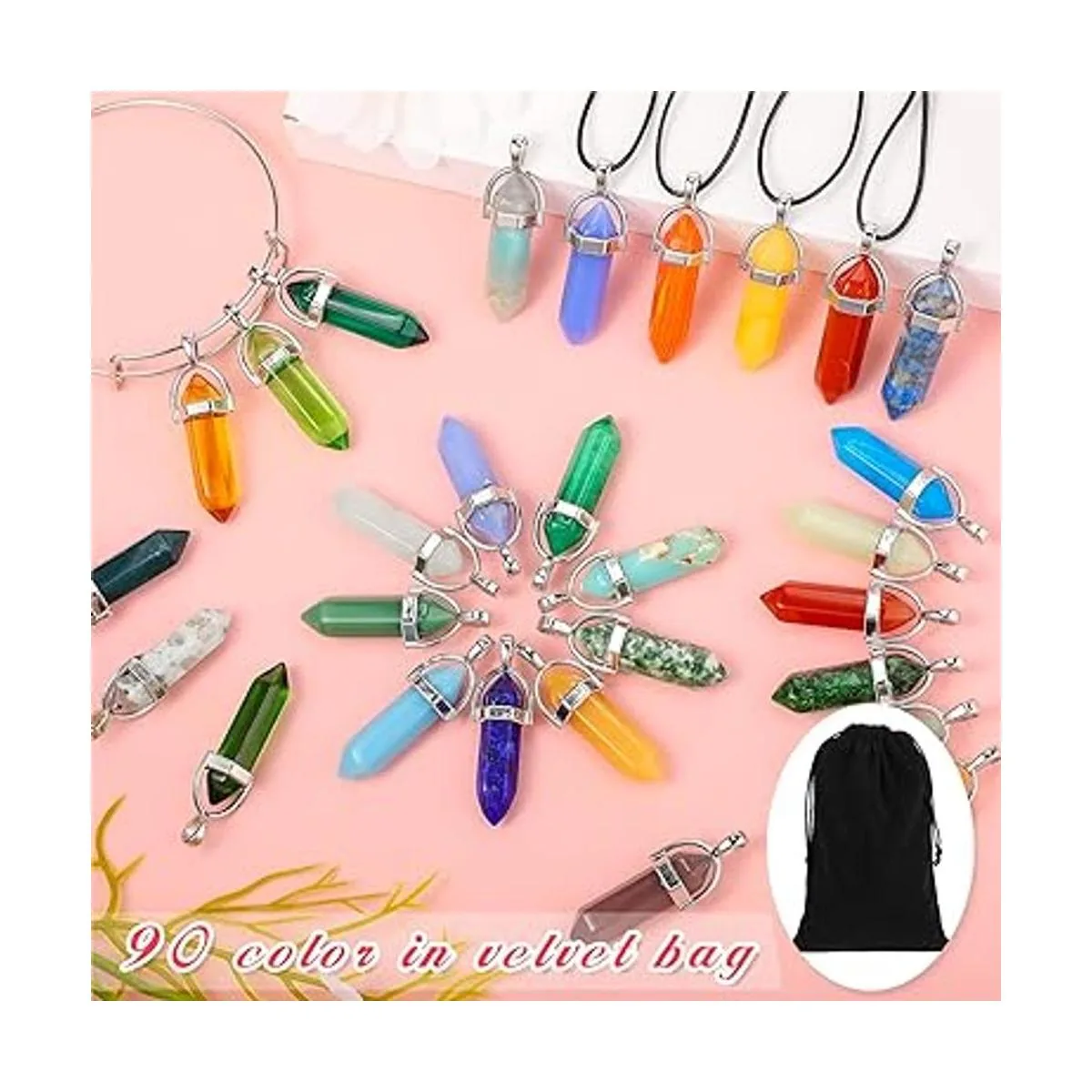 90 colgantes de cristal hexagonales de curación de chakras puntiagudos en forma de bala, colgante de piedra de piedras preciosas naturales de cuarzo con bolsa de almacenamiento para hacer collares, joyas, regalo de San Valentín, Metal Piedra natural Piedra artificial Metal, piedra natural Piedra artificial
