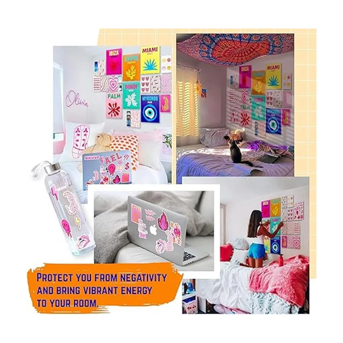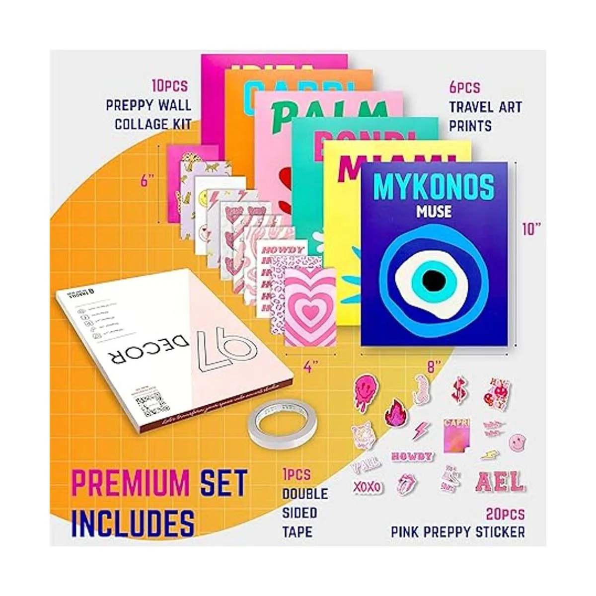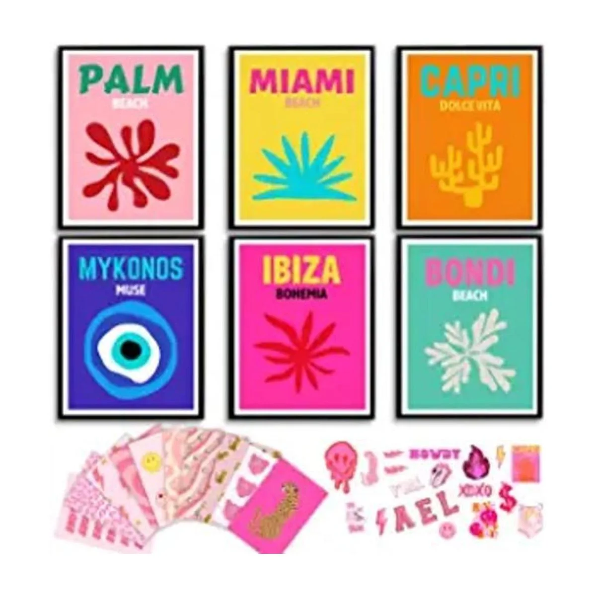 Juego premium para decoración de pared preparada: recibirás 6 impresiones artísticas de viaje de 8 x 10 pulgadas no incluye marco, 10 kits de collage preparado de 4 x 6 pulgadas y 20 calcomanías pequeñas temáticas rosas. También se incluye una cinta adhesiva de doble cara para ayudarte a colgar tus fotos preparadas