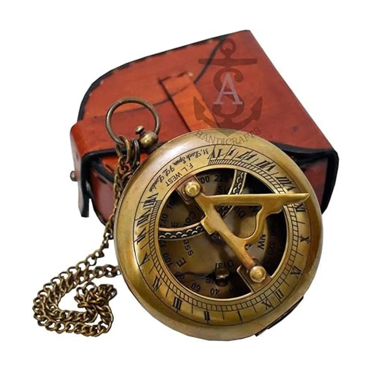 A S Handicrafts Brújula de latón con caja de cuero y cadena, mecanismo de apertura a presión, accesorio Steampunk vintage, brújula de bolsillo con acabado antiguo