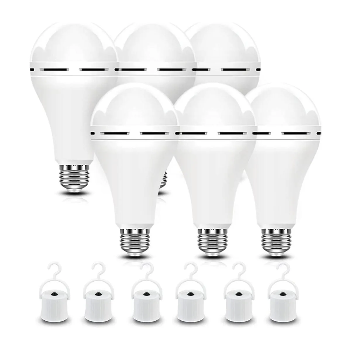Más que bombillas normales Estas bombillas de emergencia funcionan como bombillas normales durante el uso diario, pero pueden cargarse a sí mismas y luego mantener la iluminación durante el corte de energía, cada bombilla viene con un gancho, también una opción para actividades al aire libre como acampar.
