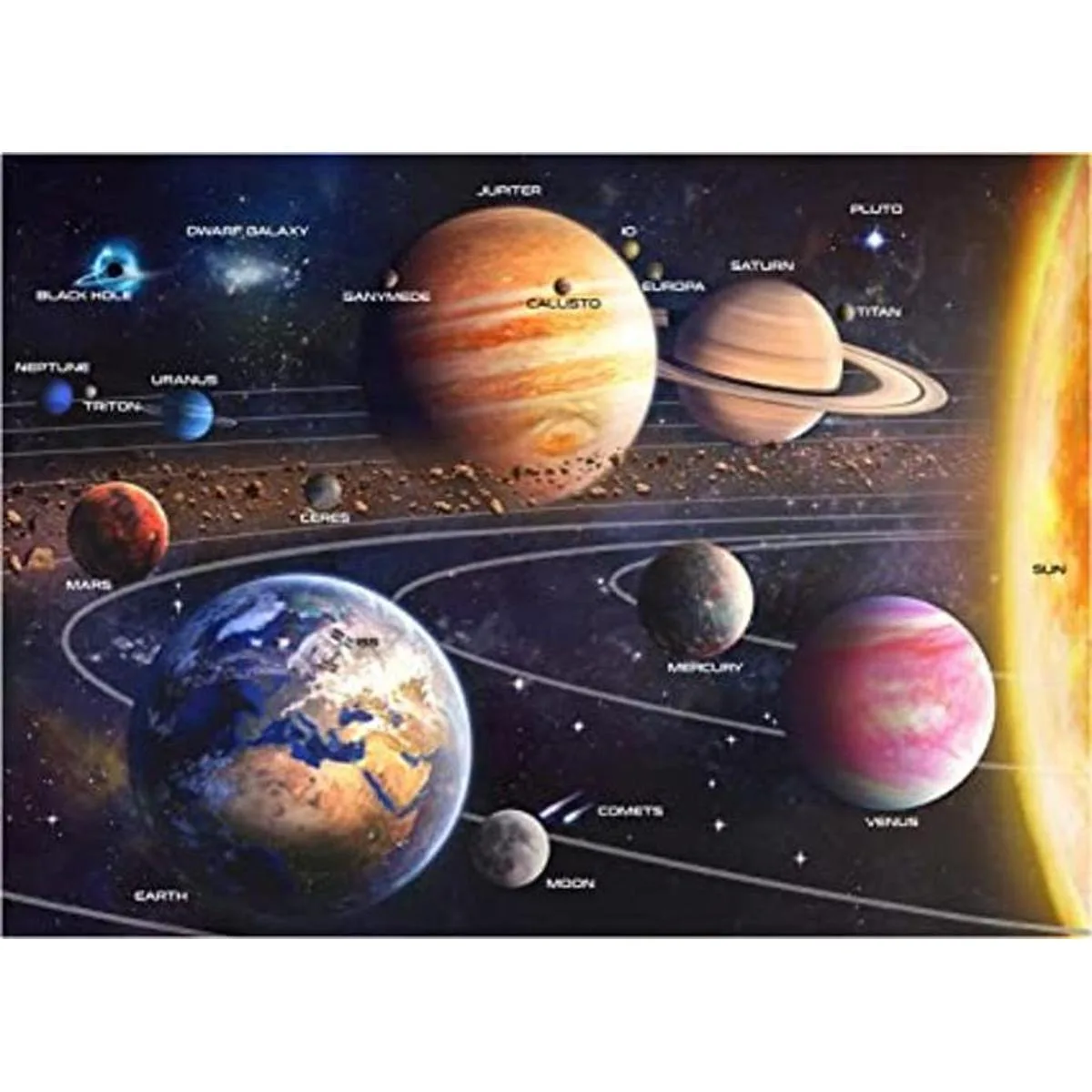 EXTRAS ENTORNOS: duplica tu deleite con un póster de 2 caras de cortesía. Tu póster cuenta con una imagen del rompecabezas planeta en 1 lado con fascinantes hechos del sistema solar en el otro.