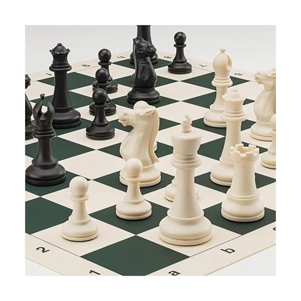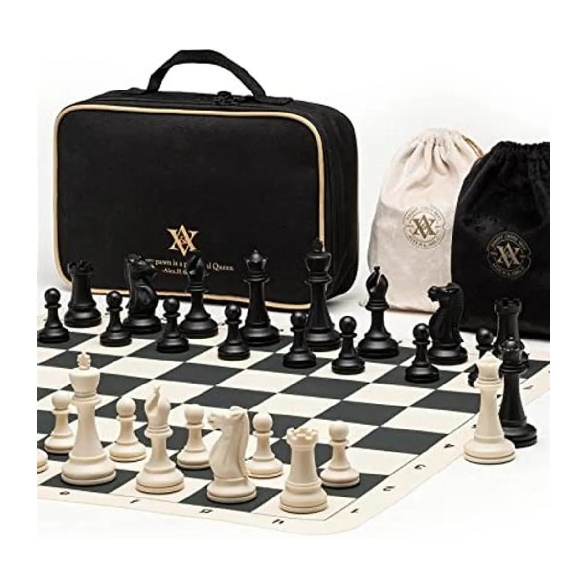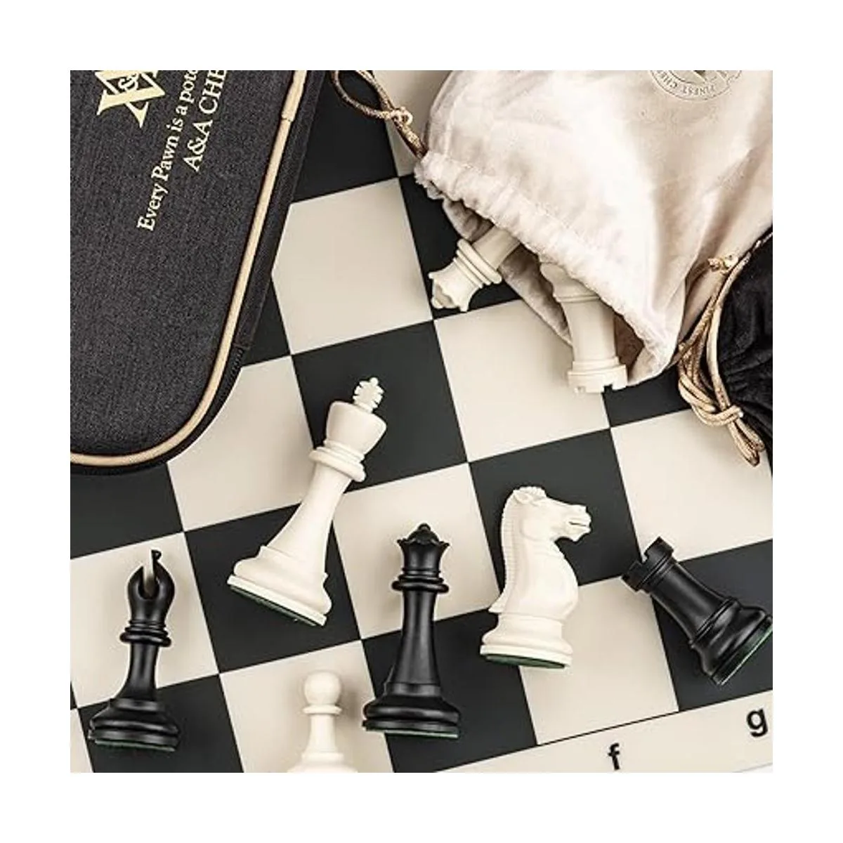 El juego de ajedrez AA viene en tamaño estándar de torneo e incluye un tablero de ajedrez de silicona de 20 x 20 pulgadas cuadrados de 2.25 pulgadas, un conjunto de piezas con peso cuádruples: altura King clásica de 3.75 pulgadas estilo Staunton con doble queen extra, dos bolsas de almacenamiento con cordón y una funda de viaje con cremallera.