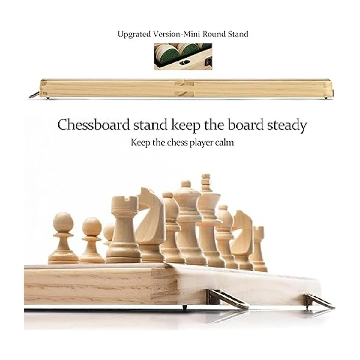 Diseño inmejorable: la porcelana de una tabla plegable tradicional siempre se abulta inevitablemente, lo que crea un gran espacio en el centro de la tabla. El mini soporte original de AA soporta la tabla como una pata de mesa, por lo que la tabla es completamente plana cuando se juega Y el mini soporte también puede proporcionar una excelente protección para la superficie de la mesa contra el bloqueo de metal de la caja de ajedrez.