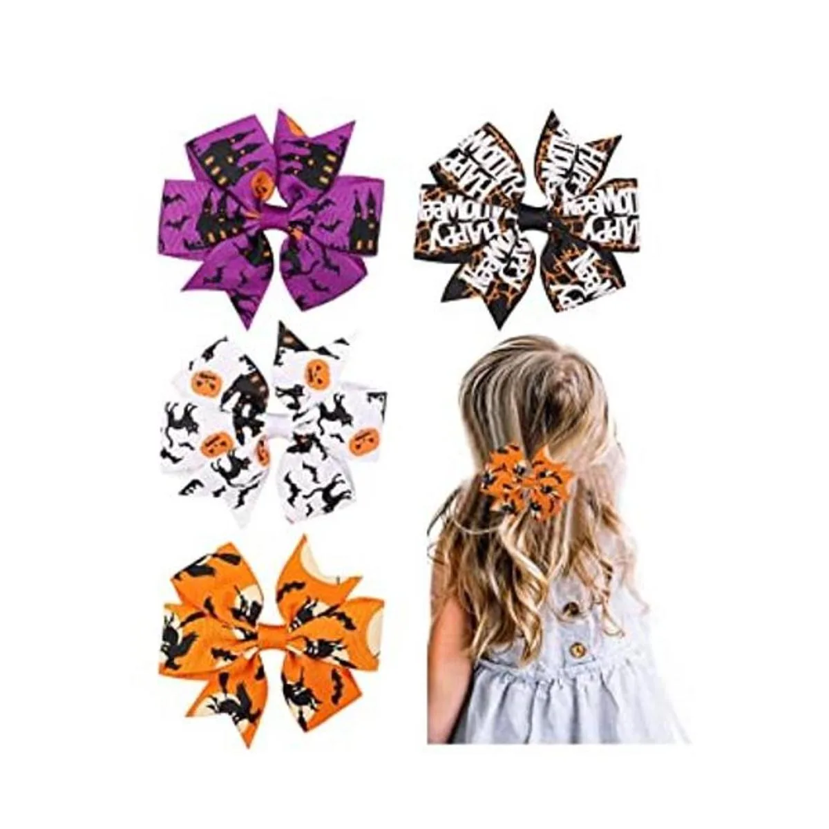 Aaiffey Clips de lazos para el cabello de Halloween para niñas, clip de telaraña fantasma, pinza de pelo de murciélago, calabaza con nudo, accesorios para el cabello de Halloween para niños pequeños, 4 piezas