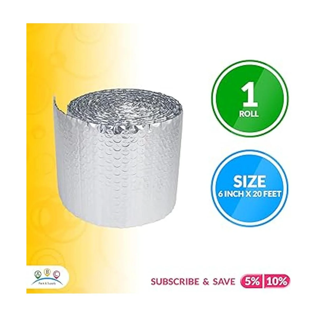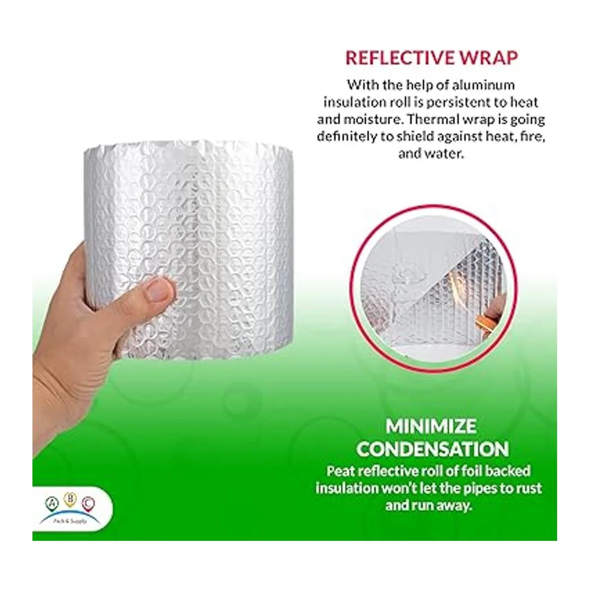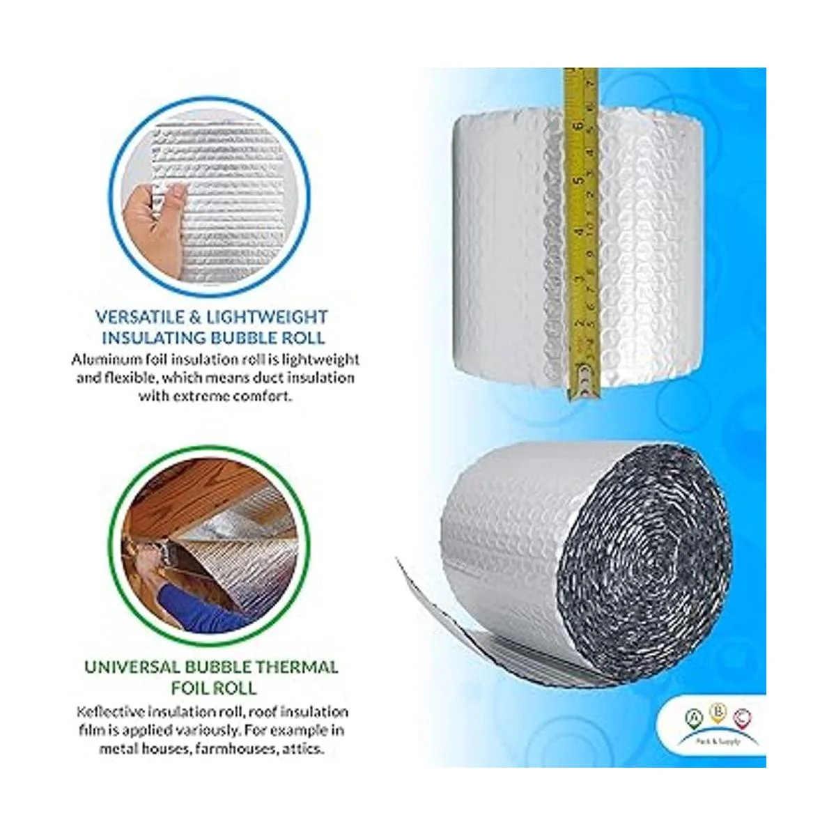 Envoltura reflectante de 6 x 20 pies: el aislamiento térmico se produce a partir de papel de aluminio con forro de burbujas. Con la ayuda del aislamiento de aluminio, el rollo de aislamiento resistente al calor es persistente para el calor y la humedad. La envoltura de aislamiento de puerta definitivamente protegerá contra el calor, el fuego y el agua.