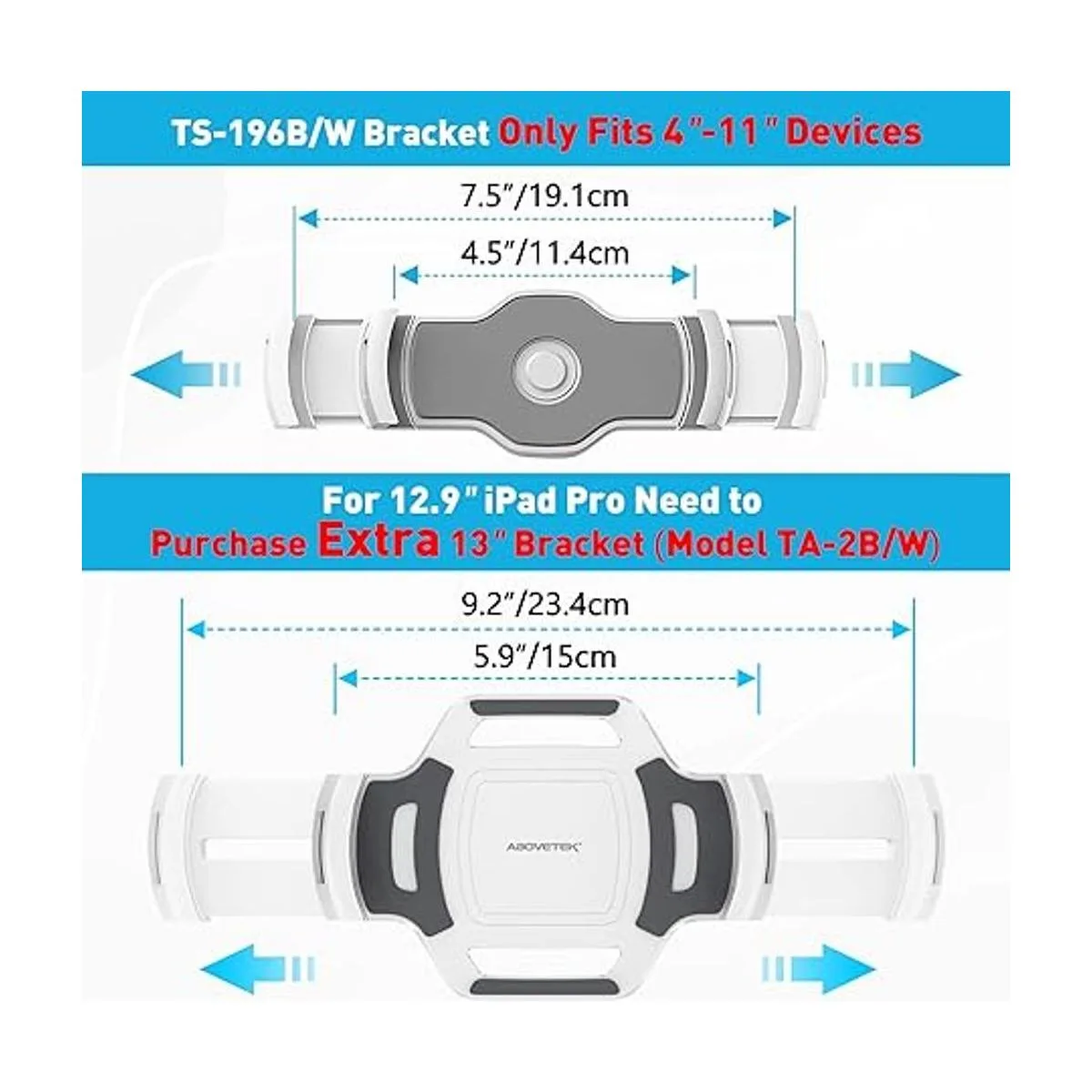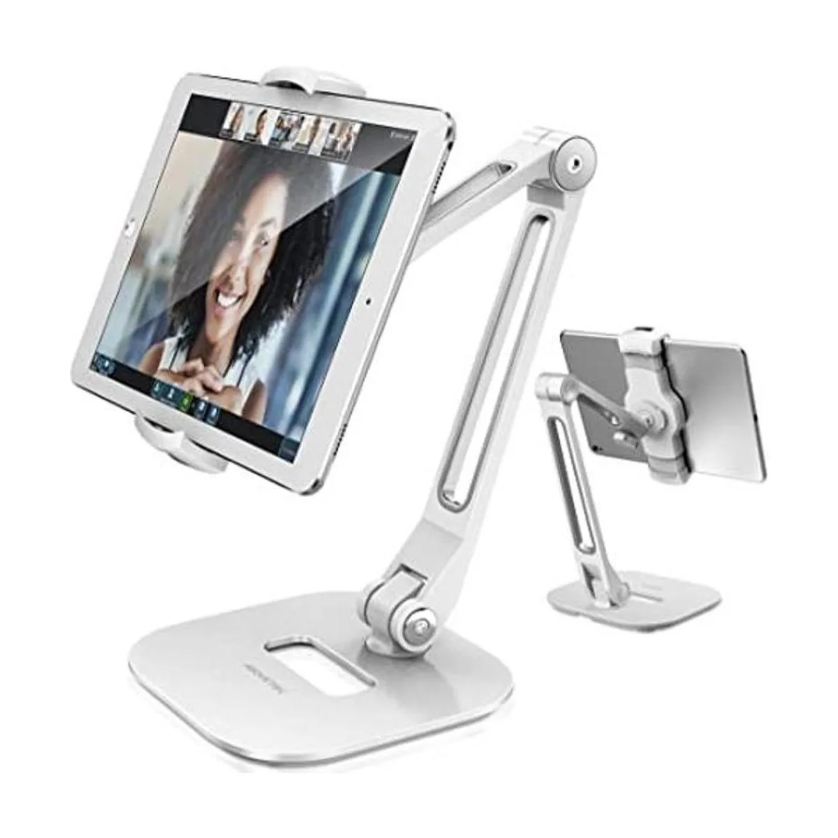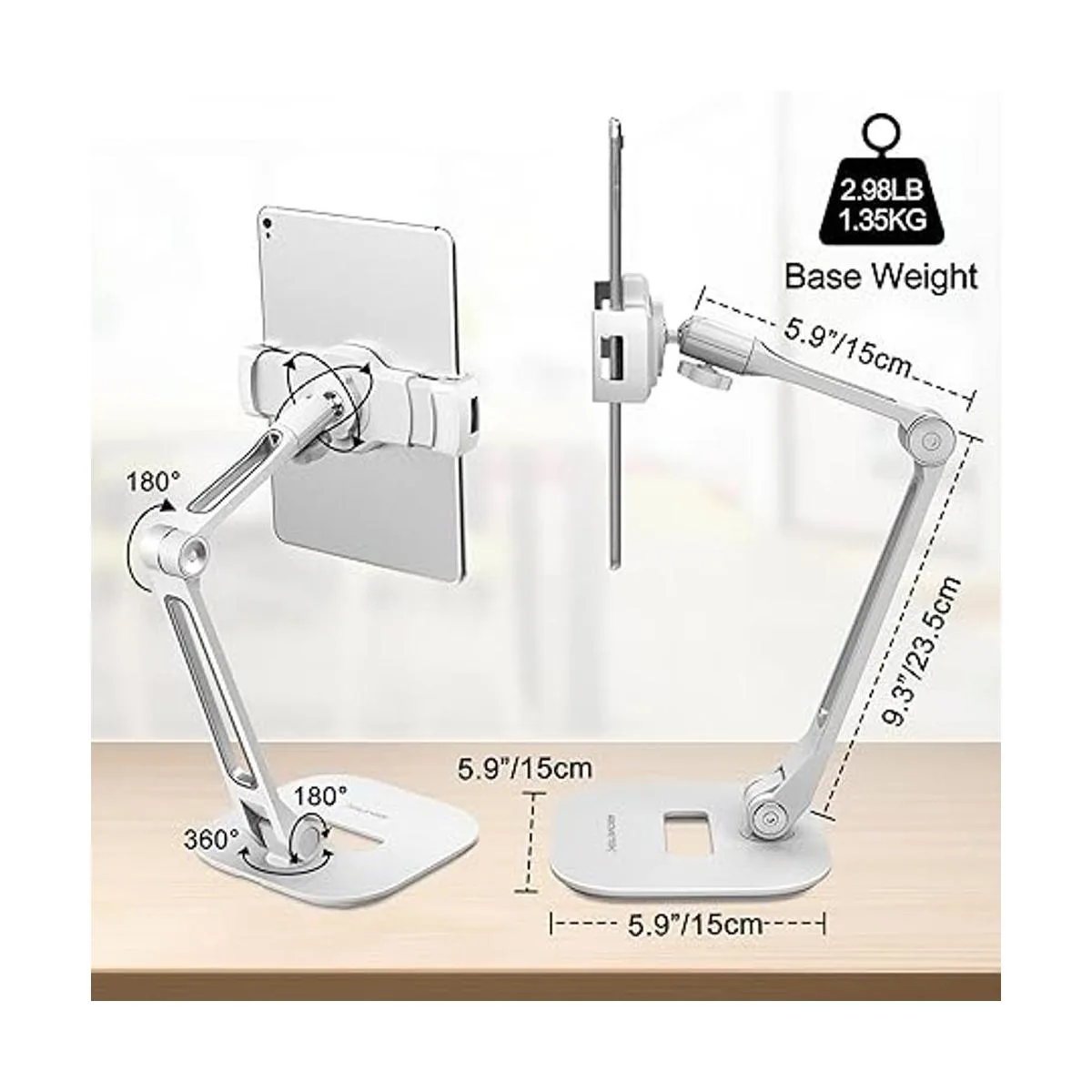 AboveTEK Soporte de aluminio para tablet de brazo largo, soporte de escritorio plegable para iPad, soporte ajustable para tableta, soporte giratorio de 360, compatible con pantalla de 4 a 11 pulgadas para mesa, cocina, kiosco, recepción, color blanco