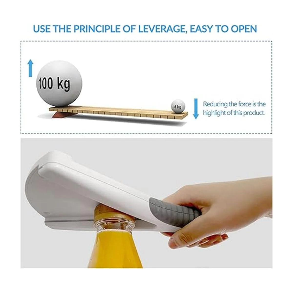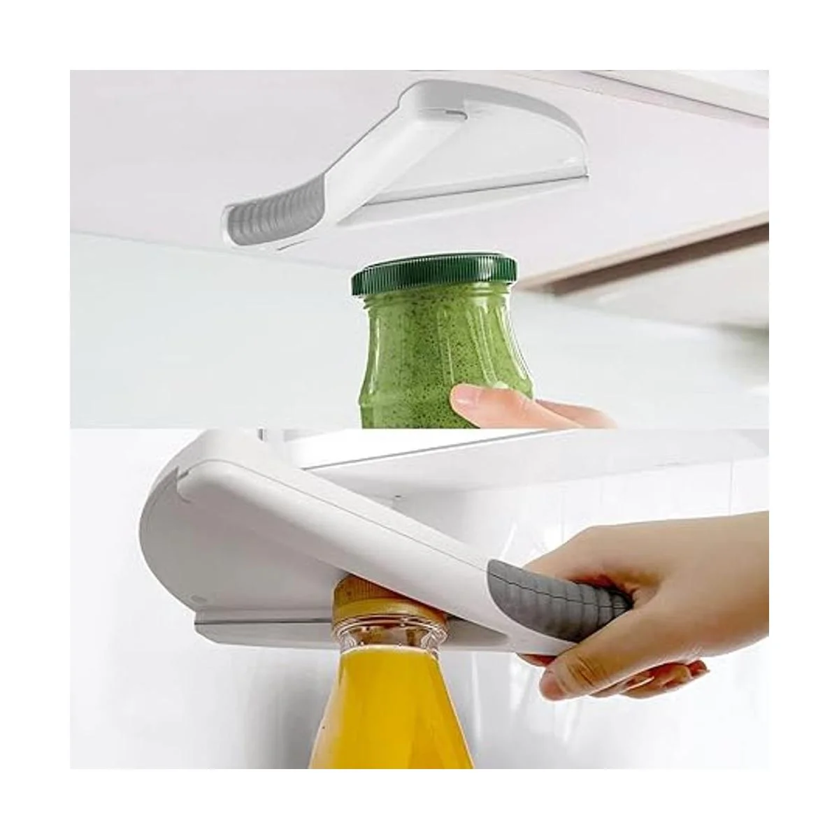 Dos maneras de usar: 1. Como abridor de tarros de mano: puedes sostener el abridor de tarros en tu mano para abrir tapas. 2. Abridor de tarros debajo del gabinete: puedes elegir instalar esta herramienta de abridor de tapas debajo de un armario, mostrador o estante para abrir tapas de tarros y ahorrar espacio de almacenamiento. Tres tornillos de montaje se proporcionan en el paquete