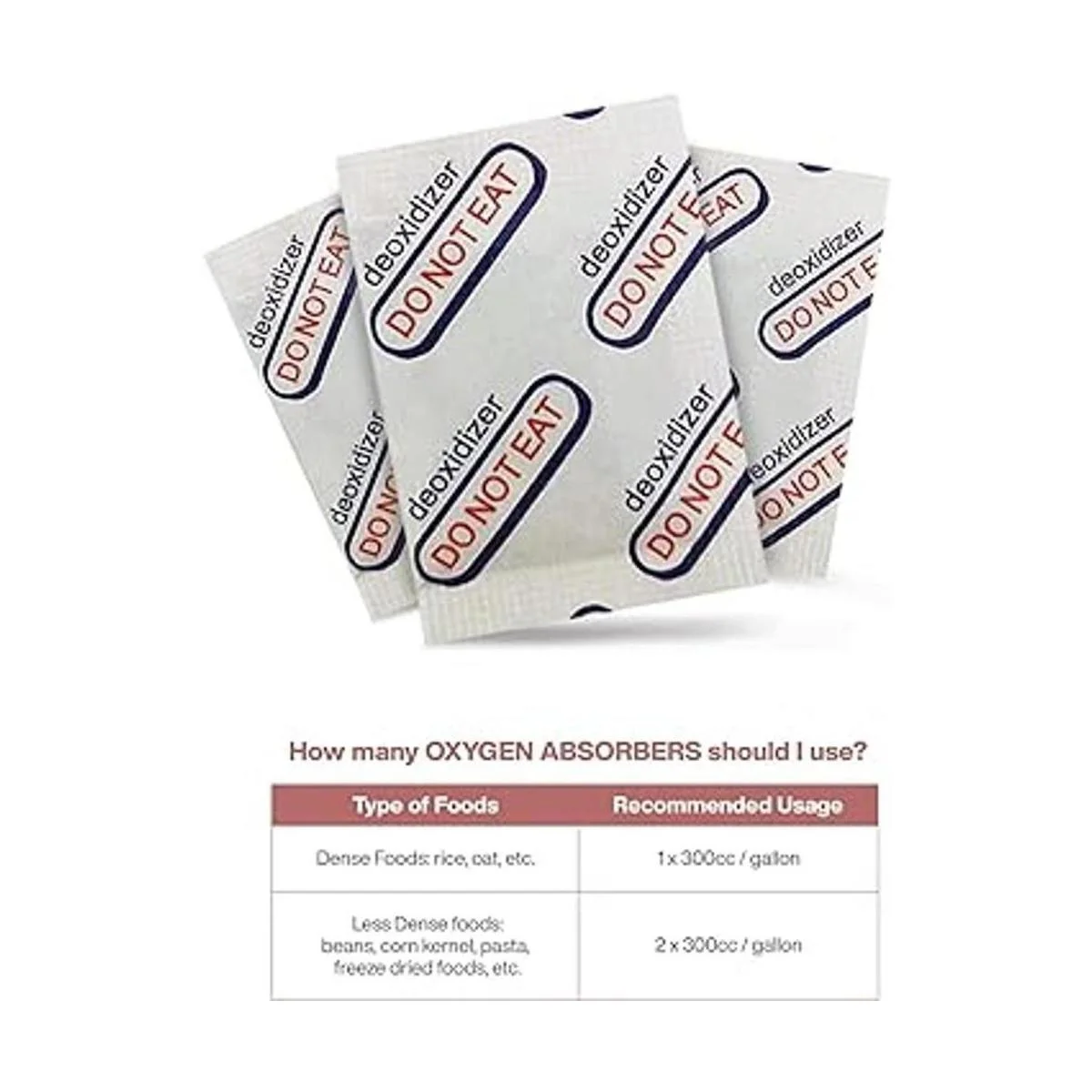 Para un almacenamiento eficaz y a largo plazo: los 100 paquetes de absorbentes de oxígeno de 300 cc se han empaquetado en 10 paquetes de 10 piezas por paquete para tu comodidad. Después de abrir un paquete de absorbentes, utiliza todo rápido y vuelve a sellar o almacena el resto en un recipiente hermético.