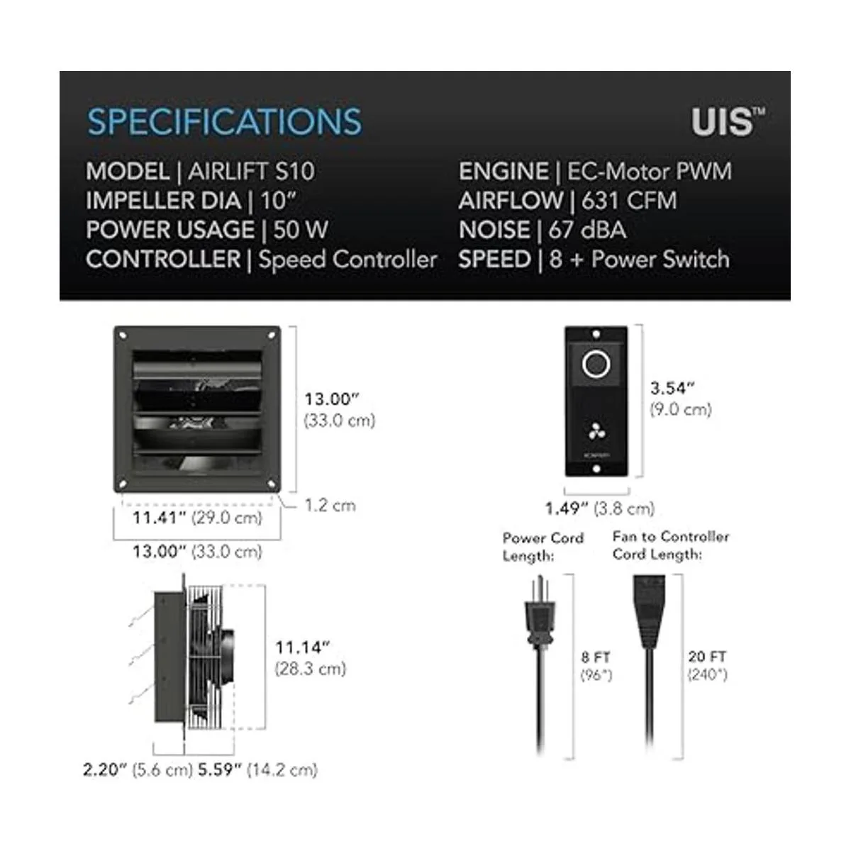 AC Infinity AIRLIFT S10, ventilador de escape de 10 pulgadas con controlador de velocidad, motor EC, ventilación y refrigeración de montaje en pared para cobertizos, áticos, talleres