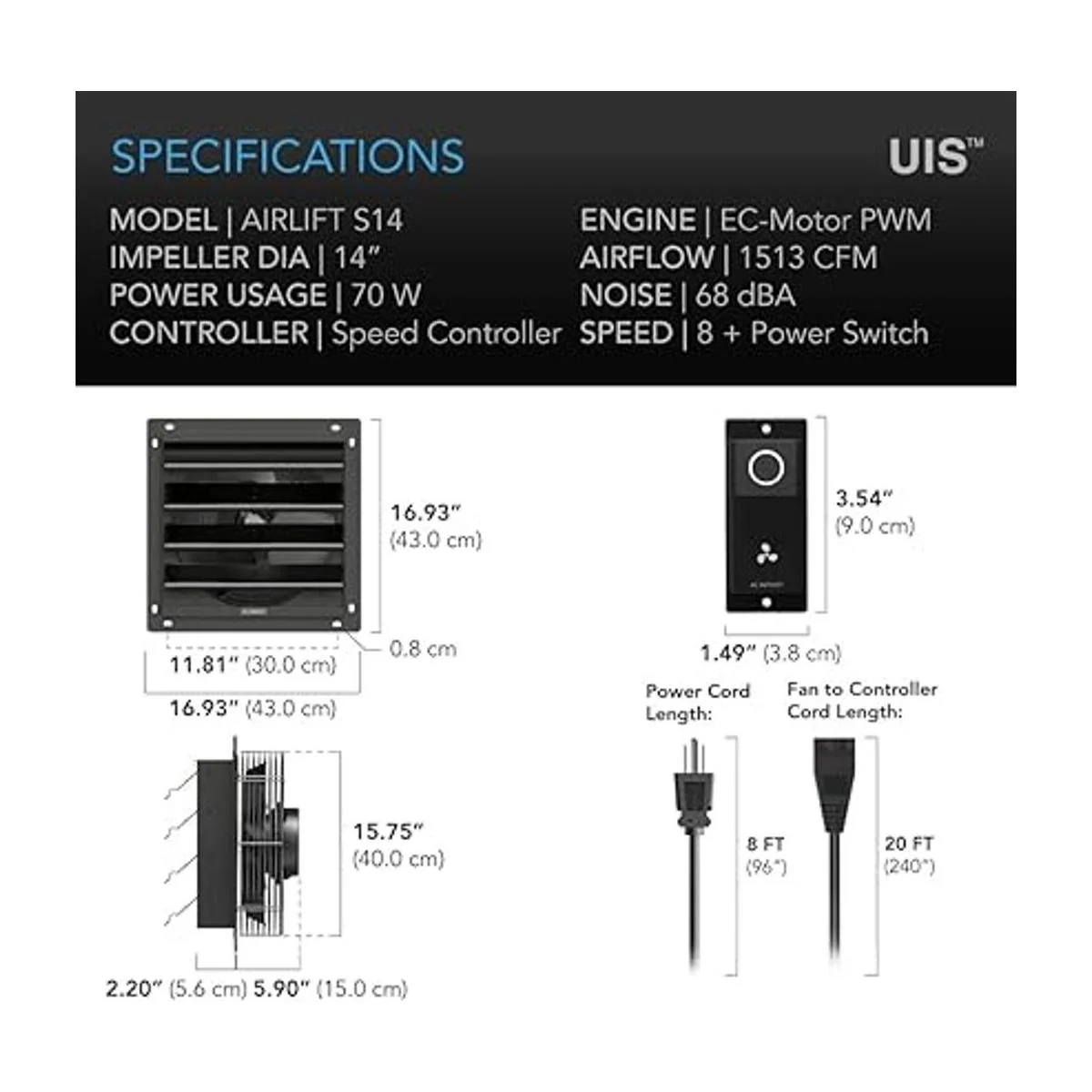 AC Infinity AIRLIFT S14, ventilador de escape de obturador de 14 pulgadas con controlador de velocidad, motor EC, ventilación y refrigeración de montaje en pared para cobertizos, áticos, talleres