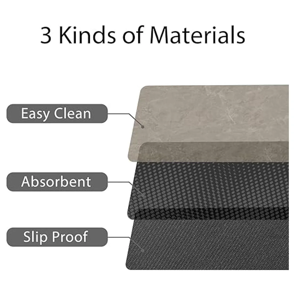 Súper absorbente, antideslizante: diseño grueso, la almohadilla de café es más absorbente, resistente a desgarros y duradera. La capa absorbente de barro de diatomía suave media puede absorber rápidamente una gran cantidad de líquido, evitando que se mueva. La parte inferior antideslizante de la estación de café se adhiere a la mesa y evita que se mueva. La parte inferior impermeable de la alfombrilla del aparato evita que los líquidos derramados dañen la mesa. Estos tapetes de secado de platos para encimeras de cocina protegerán bien tu mesa.