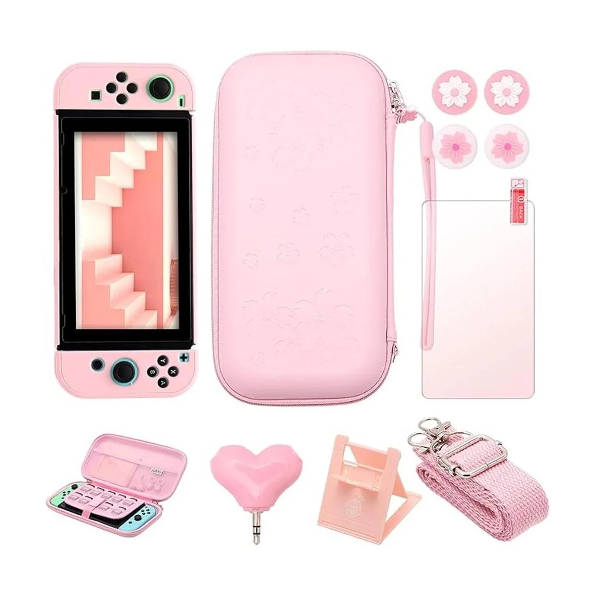 Accesorios rosa interruptor, funda de transporte rosa interruptor, funda protectora rosa interruptor, bonitos agarres para pulgar, adaptador de auriculares, soporte de escritorio, protector de pantalla, correa de muñeca y correa de hombro