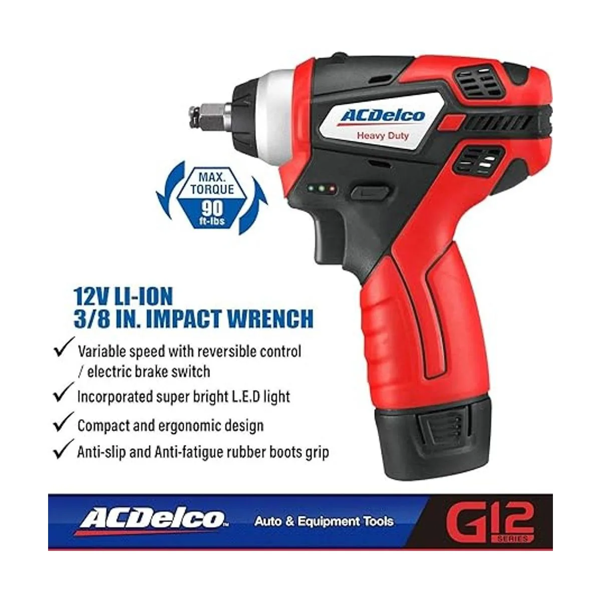 ACDelco Llave de impacto eléctrica de 38 pulgadas, luz LED inalámbrica de iones de litio de 12 V máximo, kit con 2 baterías, cargador, serie G12 ARI12104