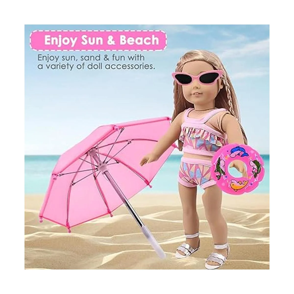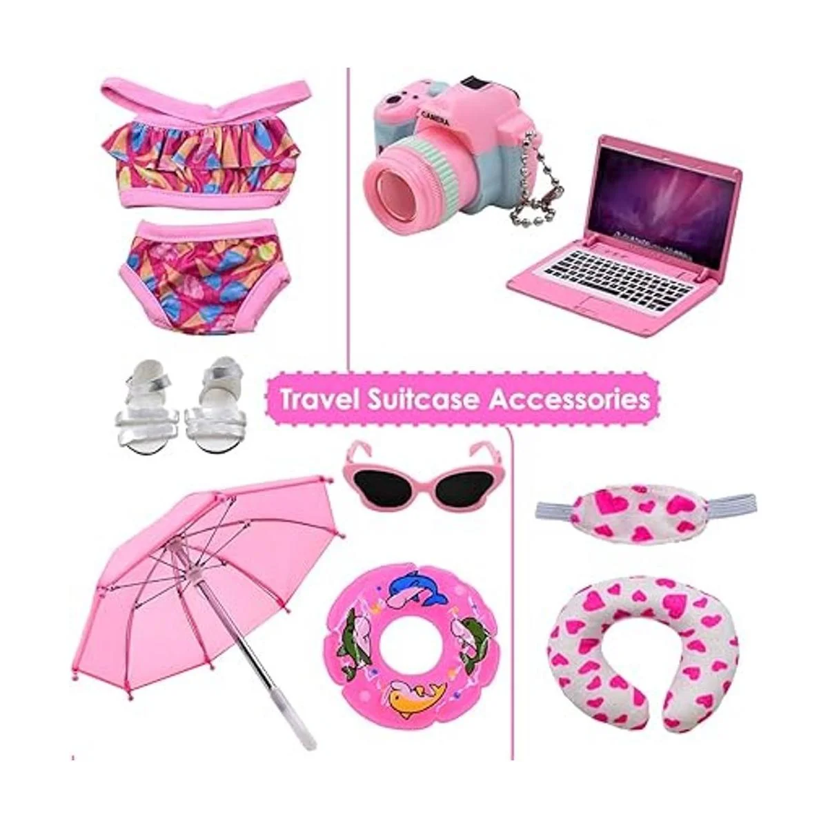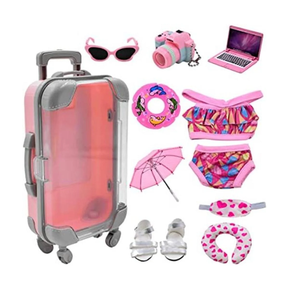 Juego de viaje para muñecas El juego de viaje de maleta de muñeca Acelane para América de 18 pulgadas incluye 10 accesorios de muñeca, 1 almohada para el cuello, 1 máscara de ojos, 1 gafas de sol, 1 computadora portátil, 1 cámara, 1 paraguas, 1 ropa de muñeca, 1 anillo de natación, 1 pantuflas, 1 maleta con ruedas.