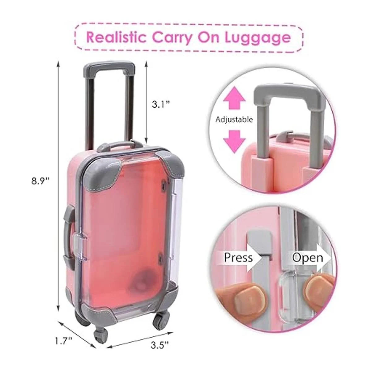 Equipaje de mano realista: este equipaje tiene asa de mano que puede subir y bajar como una real, y tiene ruedas realistas para darte una experiencia real. Mide 8.9 x 1.7 x 3.5 pulgadas, para almacenar fácilmente todos los accesorios u otros juguetes pequeños.