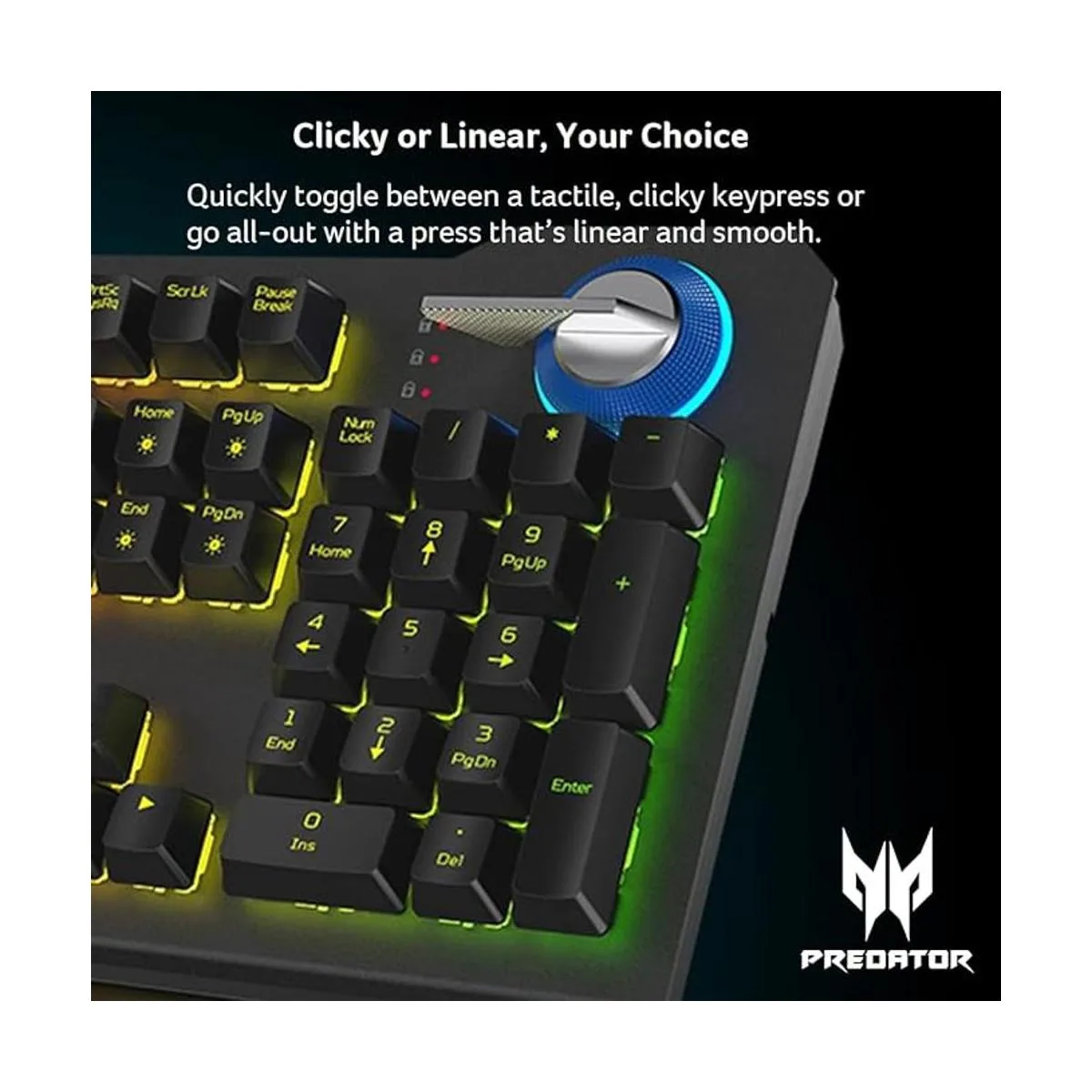 Acer Predator Aethon 700 Teclado para juegos Clicky o lineal, tu elección, retroiluminación de colores RGB de 55.1 ft, programable, teclas de medios dedicados y dial 100 antifantasma, reposamuñecas magnéticas
