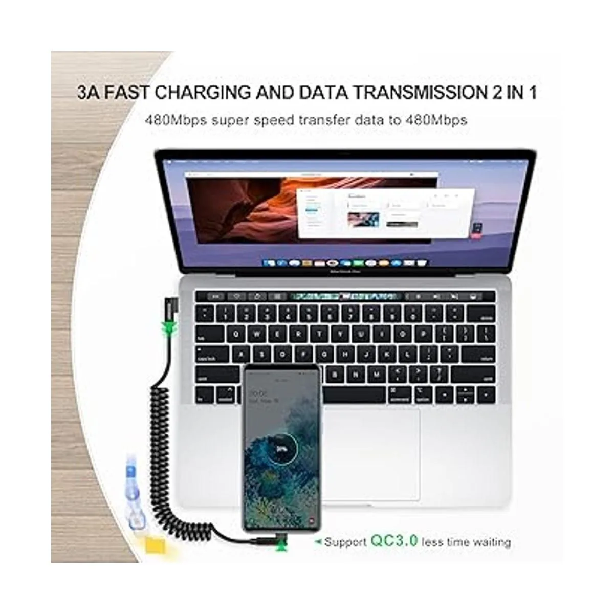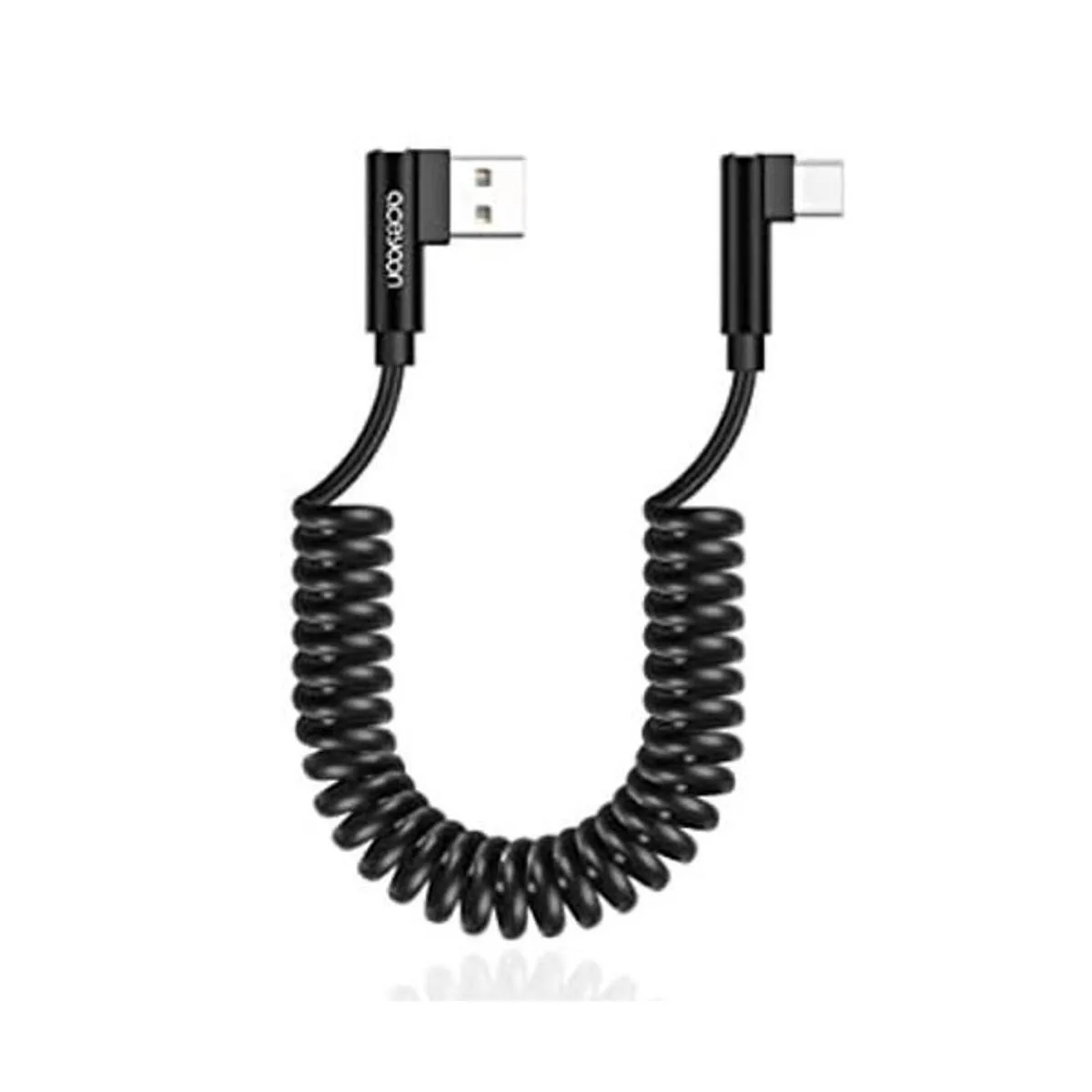 aceyoon Cable USB C en espiral de doble 90 grados, USB retráctil tipo C para automóvil máximo 3A 60 W, USB 2.0 a tipo C compatible con carga rápida QC3.0 y sincronización de datos compatible con S21S20S10, P40P30Mate30, Pixel 54