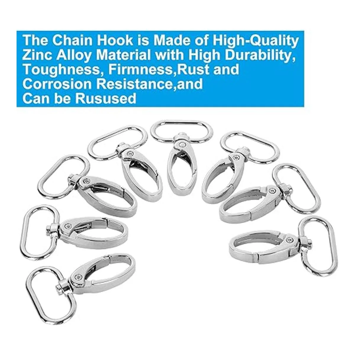 Material de los cierres de langosta curvados: este gancho de cadena está hecho de material de aleación de zinc de alta calidad con alta durabilidad, buena dureza, resistente, no se oxida ni se erosiona fácilmente, flexibilidad giratoria con base giratoria de 360 grados.