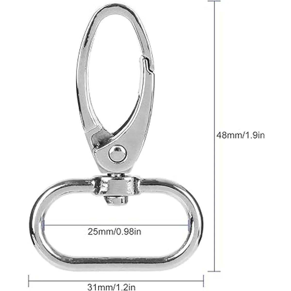 Dimensiones de los ganchos para llavero: el cierre giratorio es de aprox. 1.9 in de largo y 1.2 in exterior y 1.0 in interior de ancho.