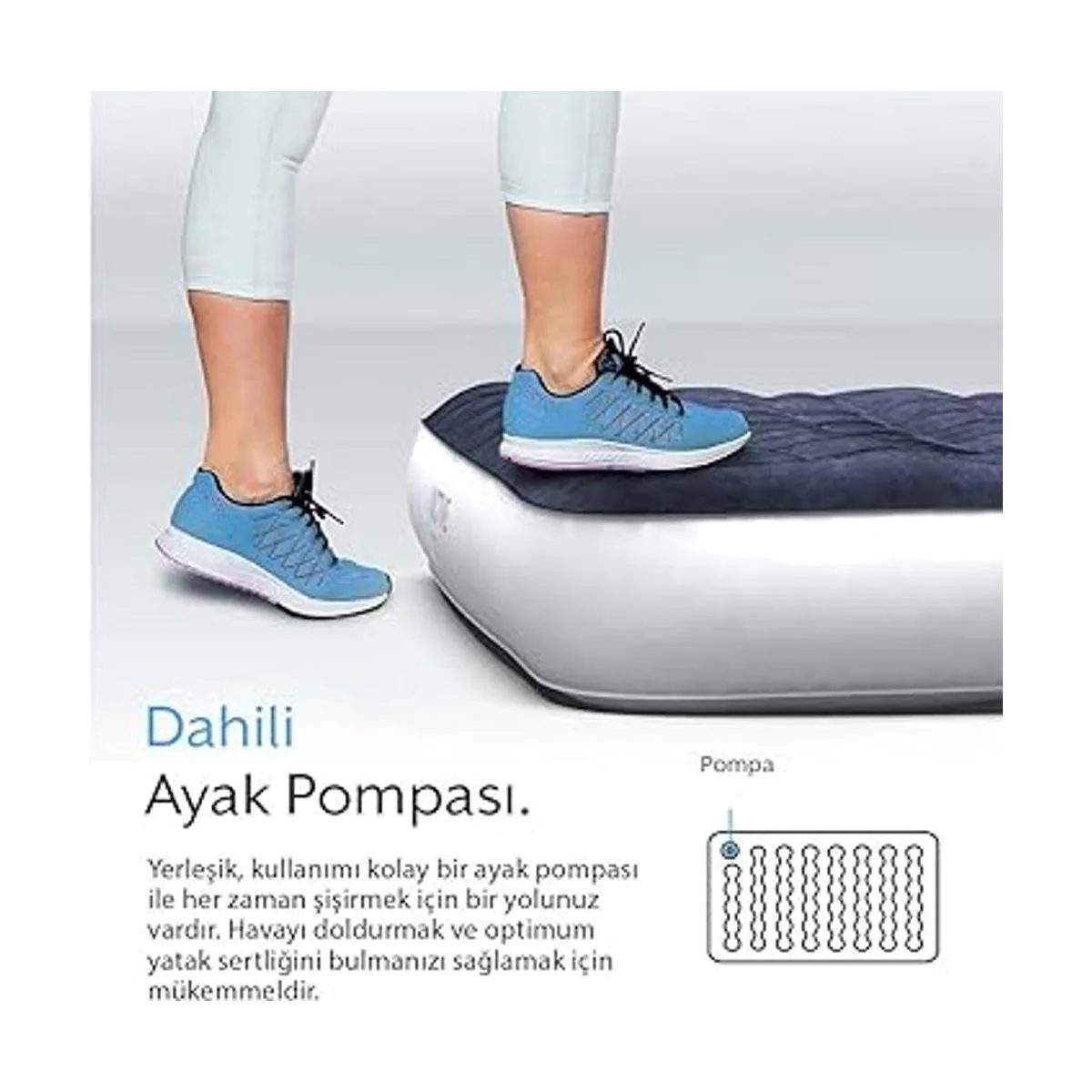 Bomba de aire recargable y bomba de pie: el colchón de aire viene con una bomba eléctrica pequeña y ligera pero potente para una rápida y fácil inflación y desinflación. La bomba de cama sopla completamente el colchón de camping en menos de 2 minutos, y se puede recargar rápidamente con el cable USB incluido. Una bomba de pie manual también está integrada en la cama de aire que te permite inflarla sin la bomba automática.