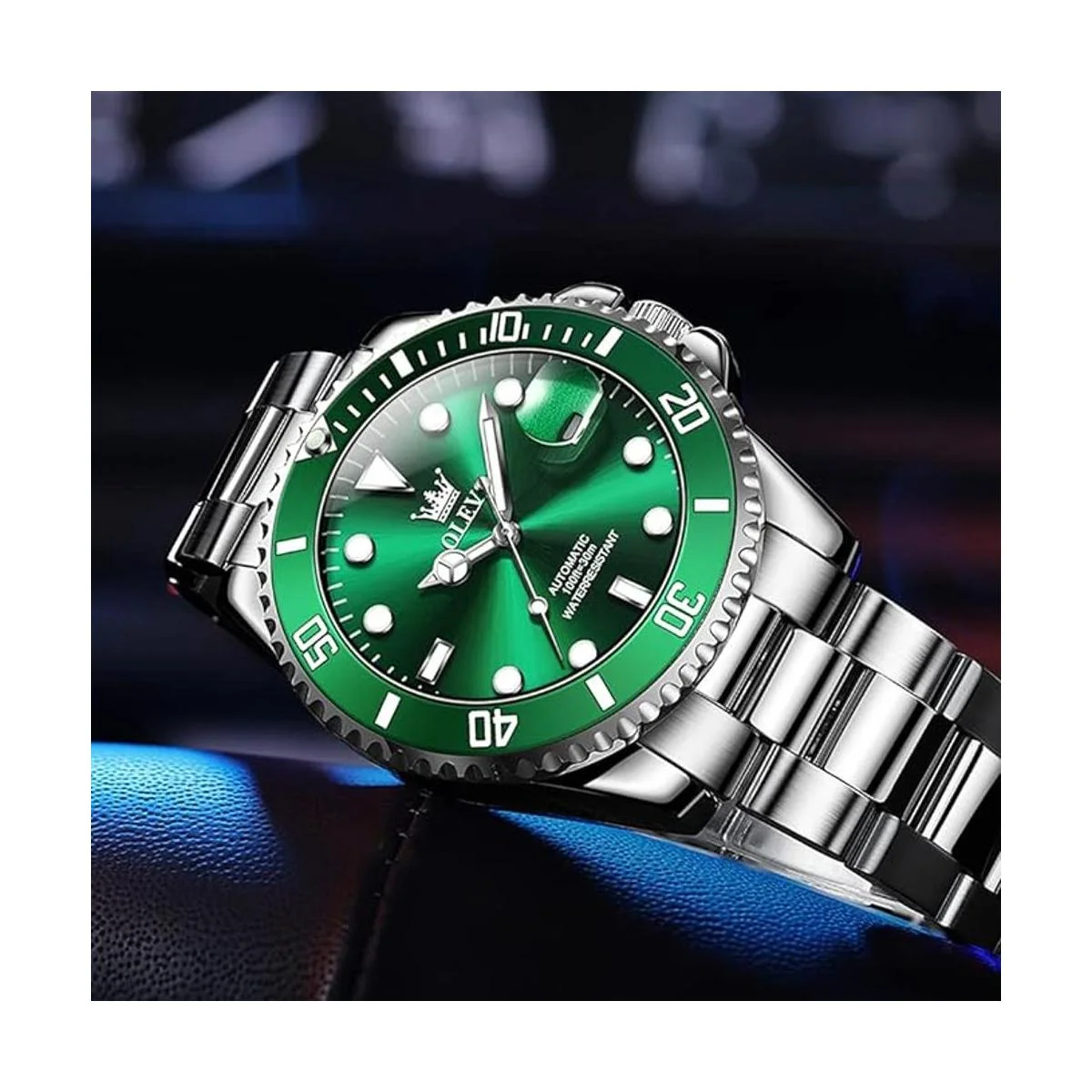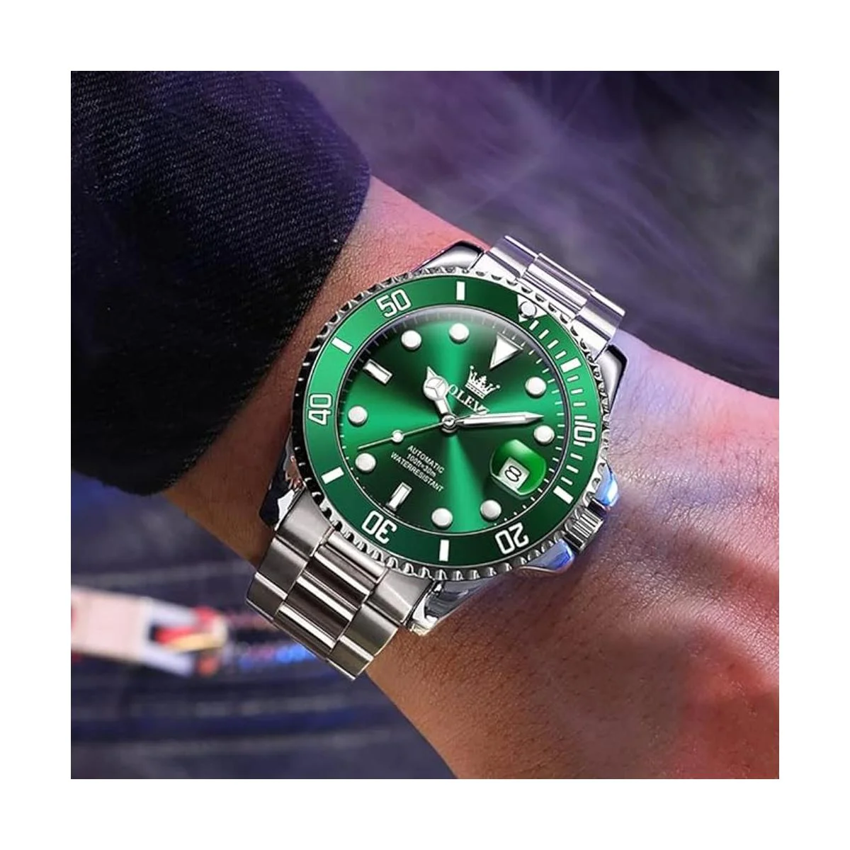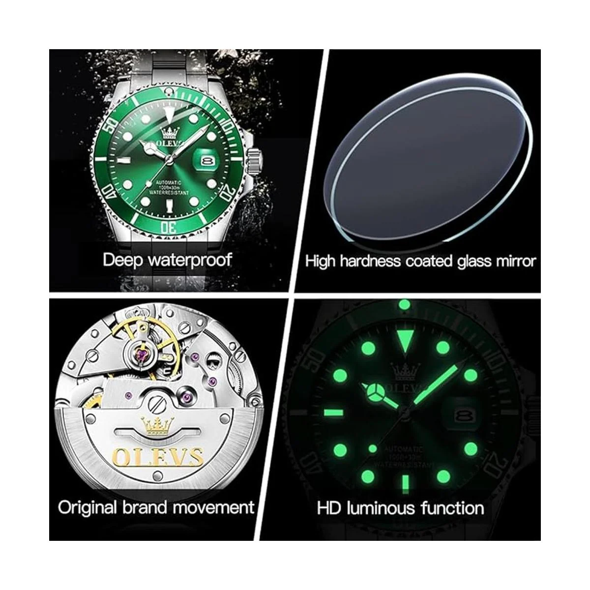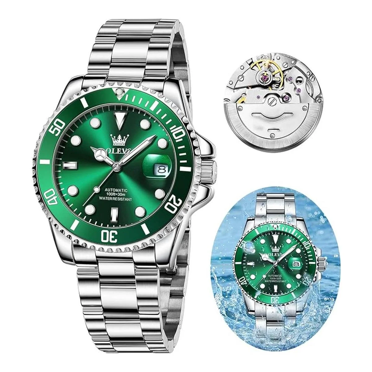 Diseño clásico: el reloj submarino tiene una ventana de fecha ampliada a las 3 en punto, manecillas luminosas, fácil de leer en todo momento, cuerda automática mecánica, rendimiento estable, hora precisa, sin batería. Resistente al agua hasta 98.4 ft, puede soportar el lavado de manos, la lluvia. No apto para bañarse.