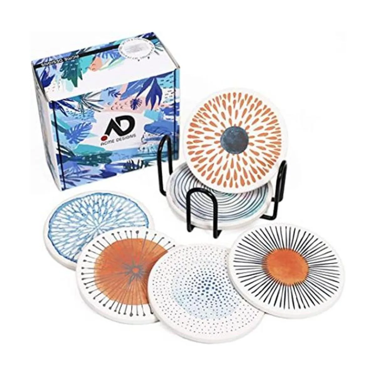 AD Juego de 6 posavasos con soporte para bebidas que absorben posavasos redondos de piedra de cerámica con base de corcho, tapete de protección de mesa para tazas y tazas, oficina, cocina colorido con soporte