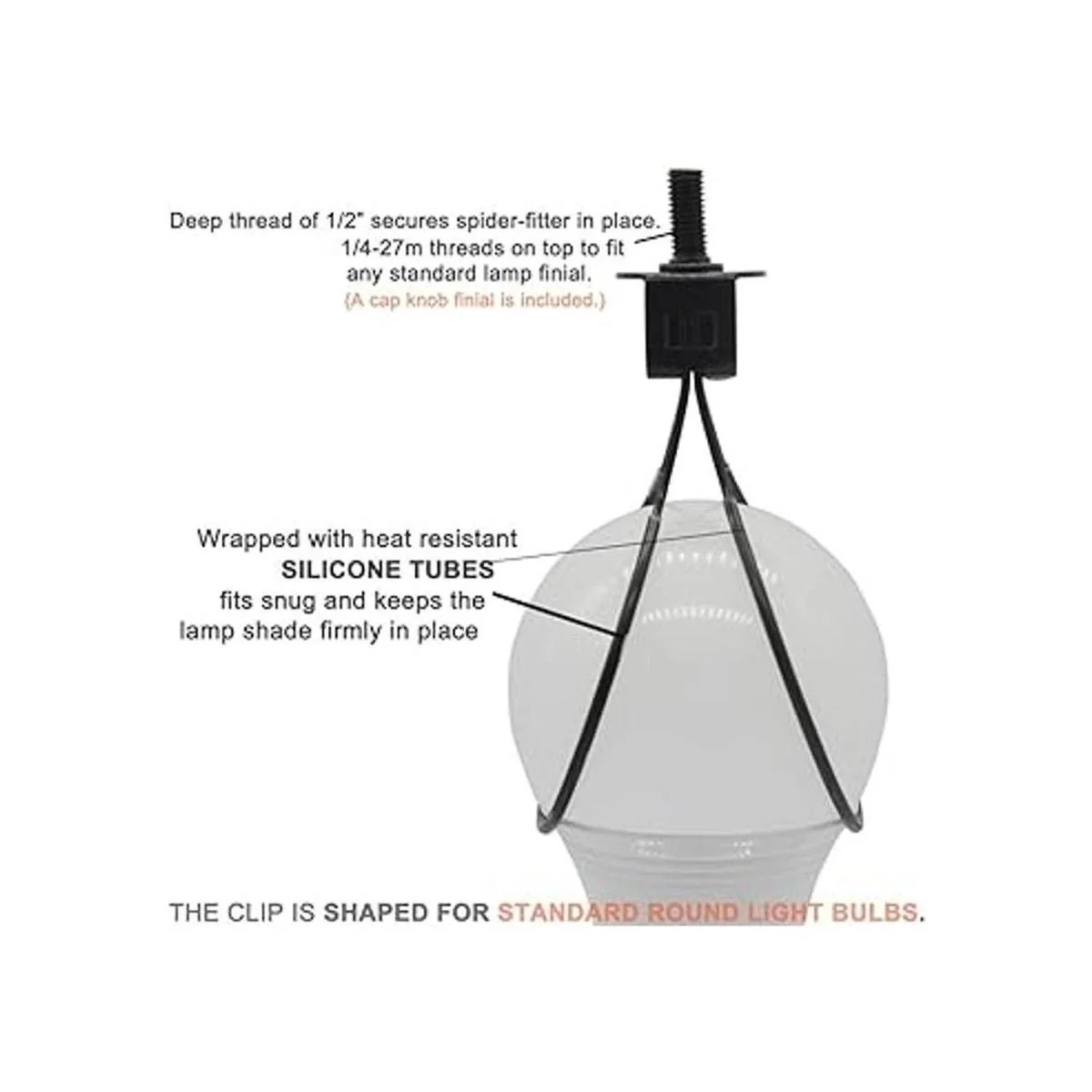 Estructura de ajuste perfecto: 4.25 pulgadas en total, desde la bombilla hasta el remate es de aproximadamente 2 pulgadas, mantiene la pantalla a la altura adecuada. Roscas de 1/4 a 88.6 ft en la parte superior para adaptarse a cualquier remate de lámpara estándar ya tiene un remate de perilla de tapa. La rosca es de 1/2 pulgada de alto. Su parte superior profunda es perfecta para una pantalla de araña sin arpa